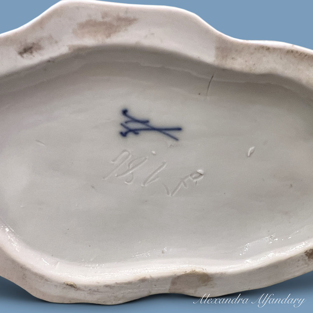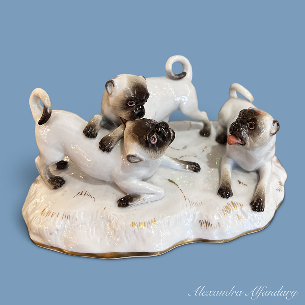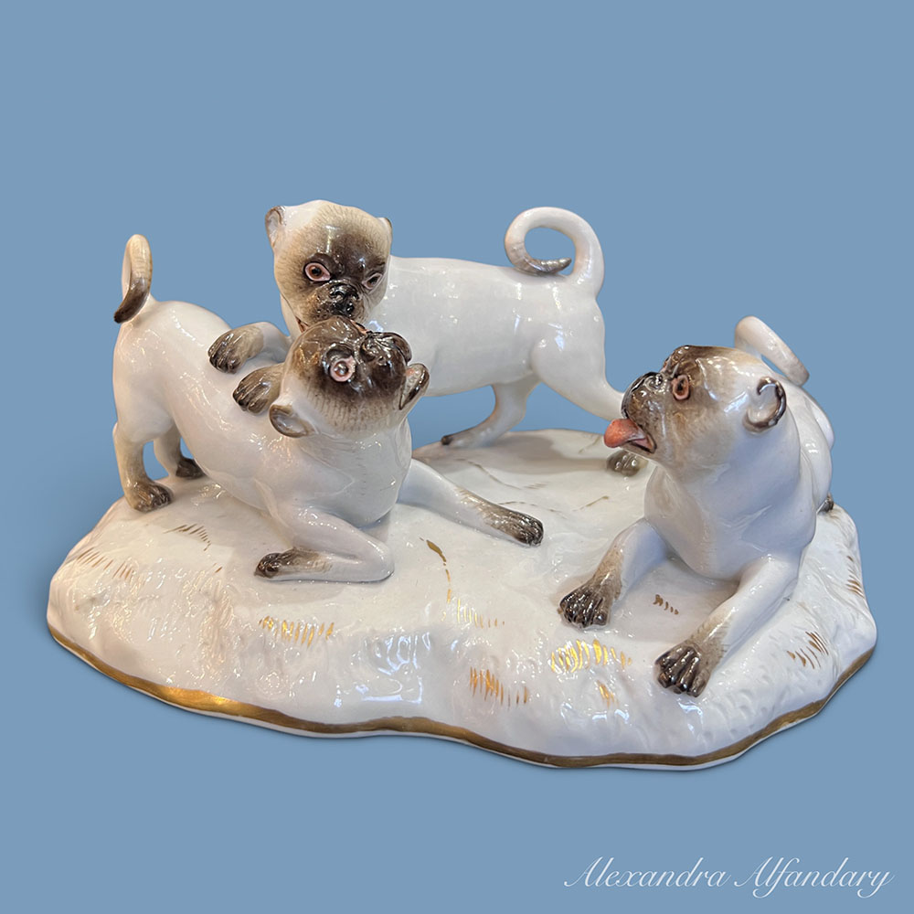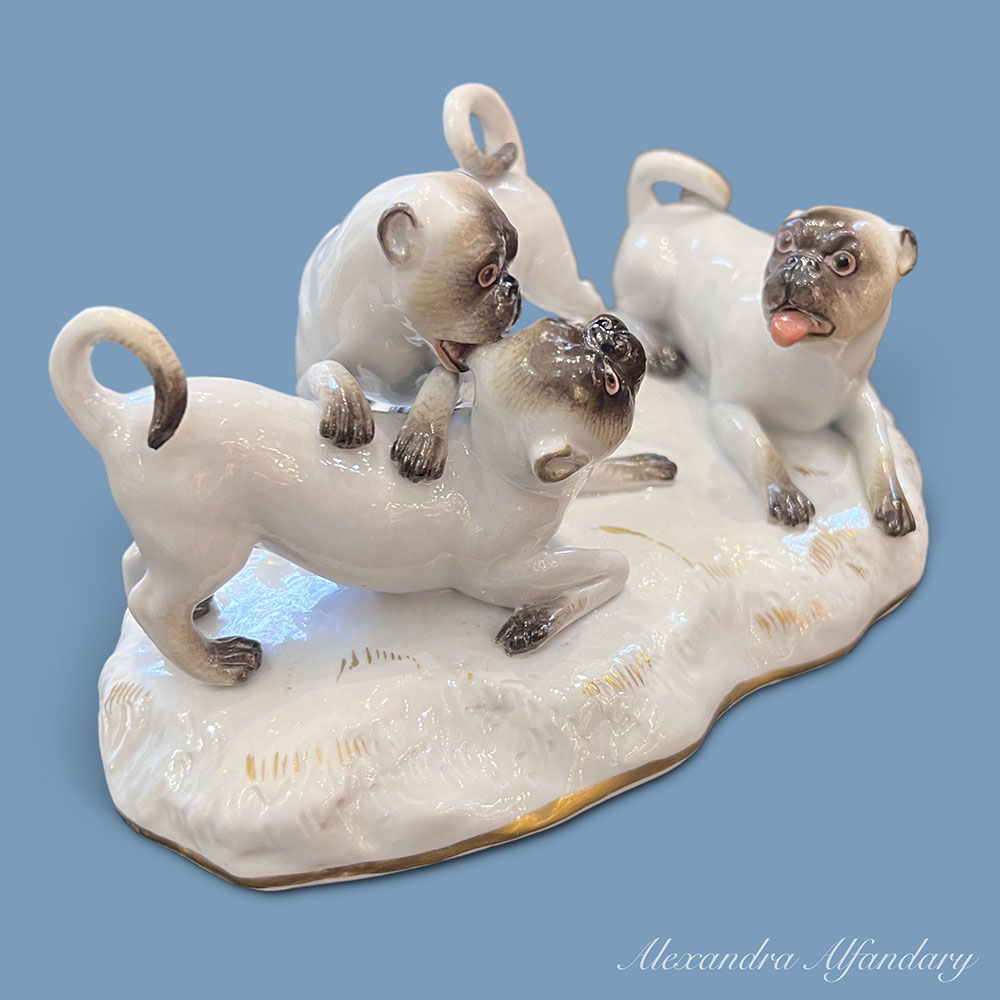 The Meissen porcelain group of three pugs at play dates from the late 19th century, the model by J. J. Kaendler, the well modelled features of the pugs animated and life like, Meissen blue crossed swords to base.