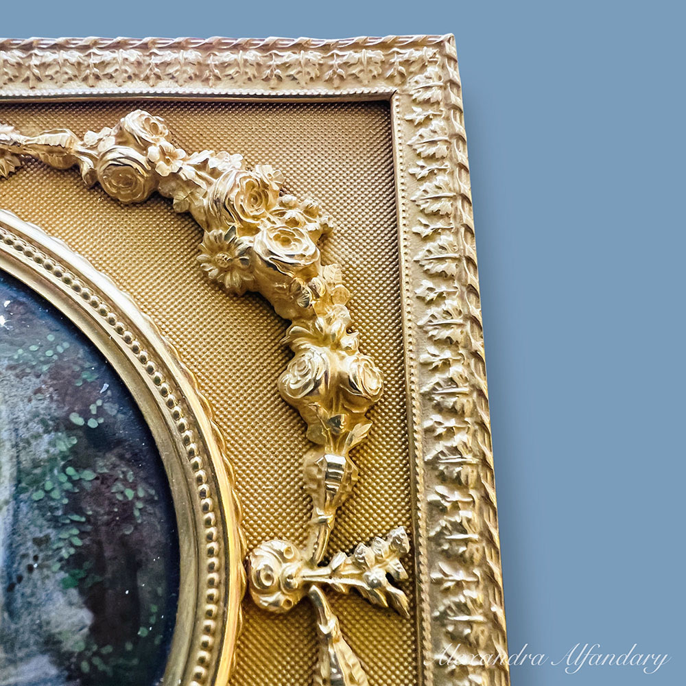 The French ormolu box is profusely decorated in relief with leaves and flowers, the lid with ormolu garlands and a central enamel plaque painted with polychrome females next to fountain with turtle doves indistinct signature to bottom right side.