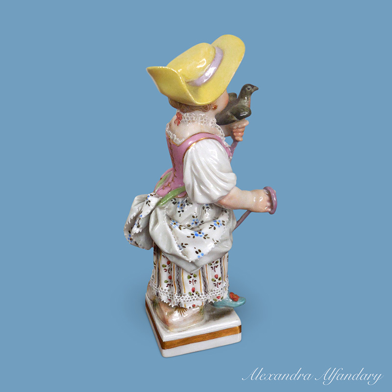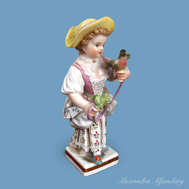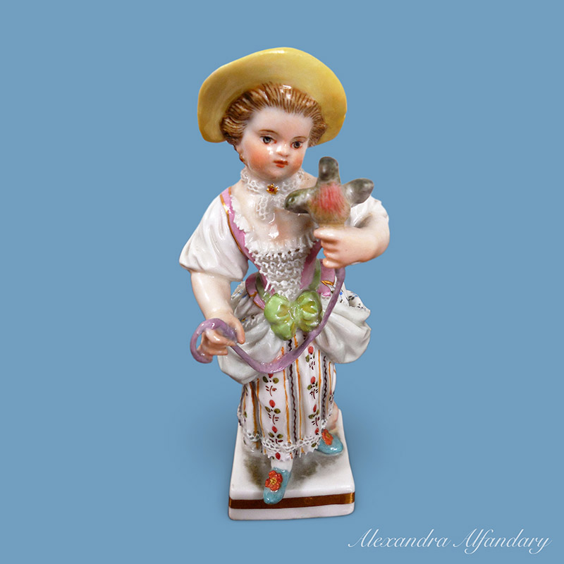 The little figure of a girl holding her pet dove by a pink ribband is dressed in a patterned dress, lace bodice and stands on a square base, Meissen crossed swords to base.