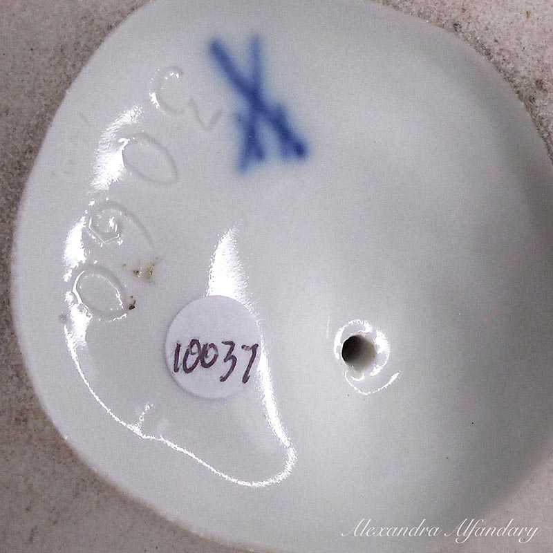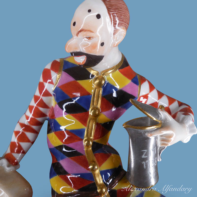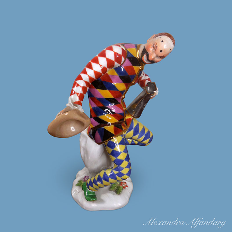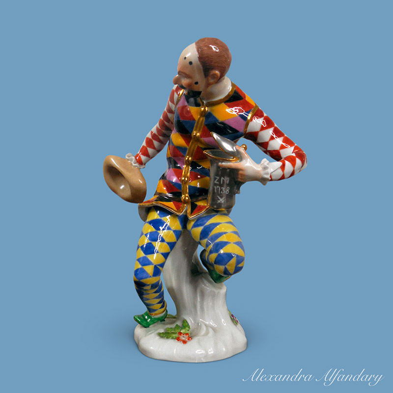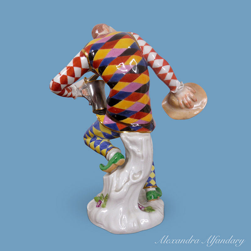 The Meissen harlequin, dressed in colourful diamond pattern trousers and jacket, holding a hat in his right hand and a silver tankard marked with the year 1738 and crossed swords, bowing in a greeting manner, Meissen blue crossed swords to base.