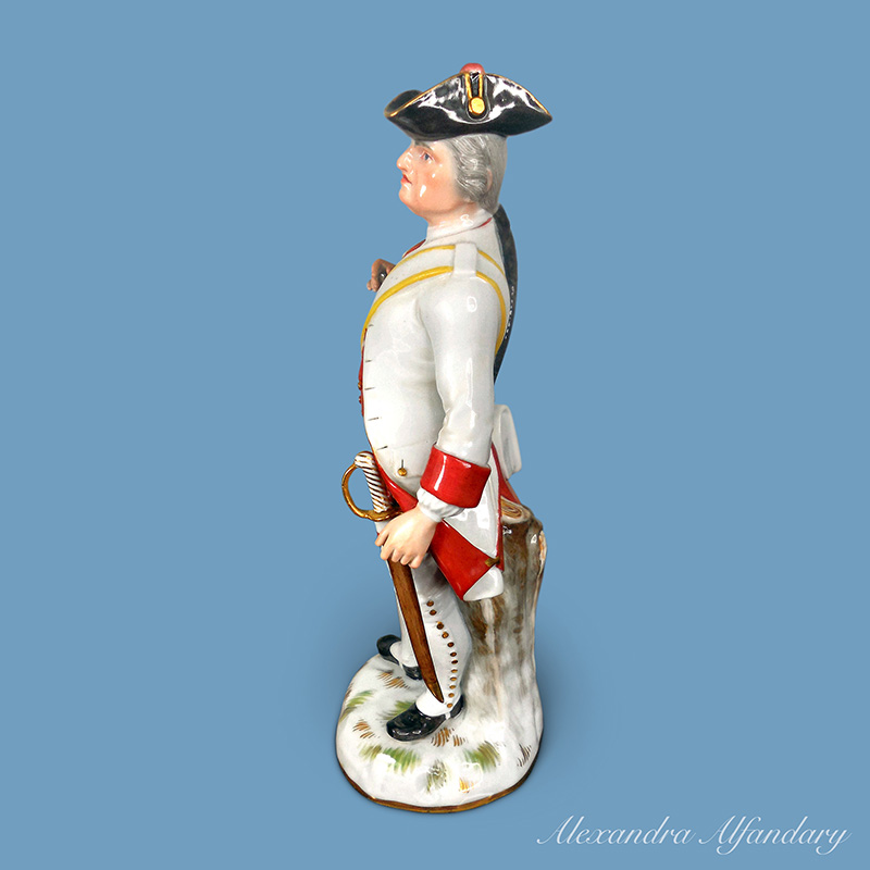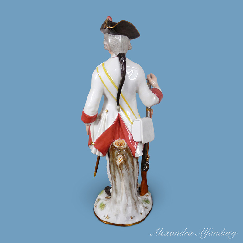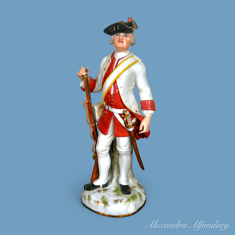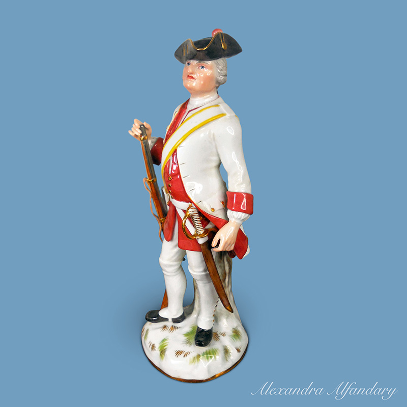 A good Meissen porcelain figure of a soldier dressed in the red and white Saxon uniform, black tricorne hat, holding a rifle in his right hand, a sword hanging from his left side, a well modelled, figure of a Saxon soldier, Meissen crossed swords to base.
