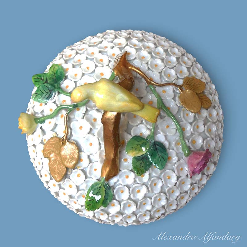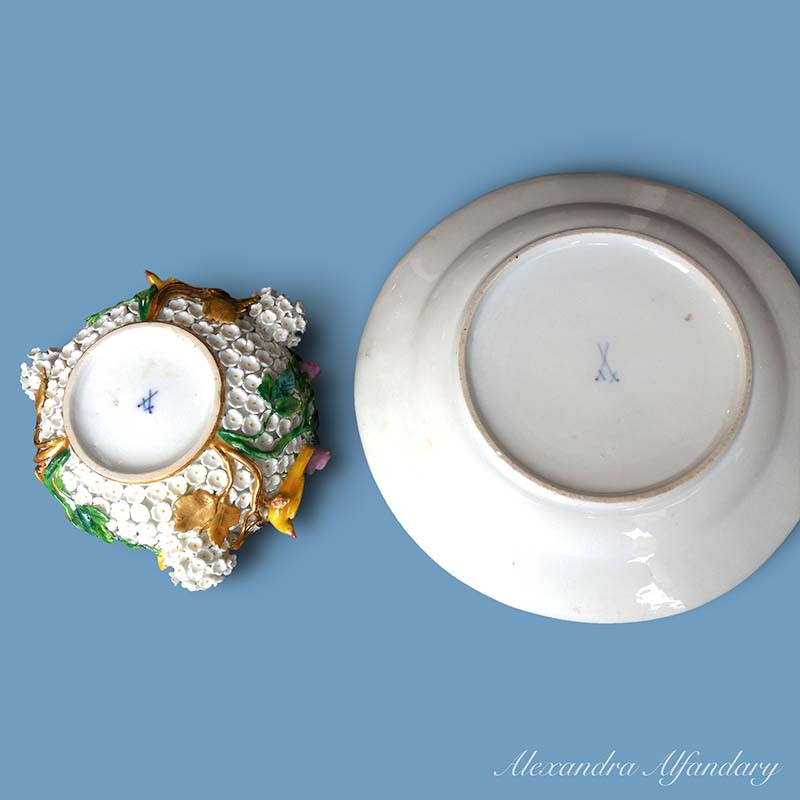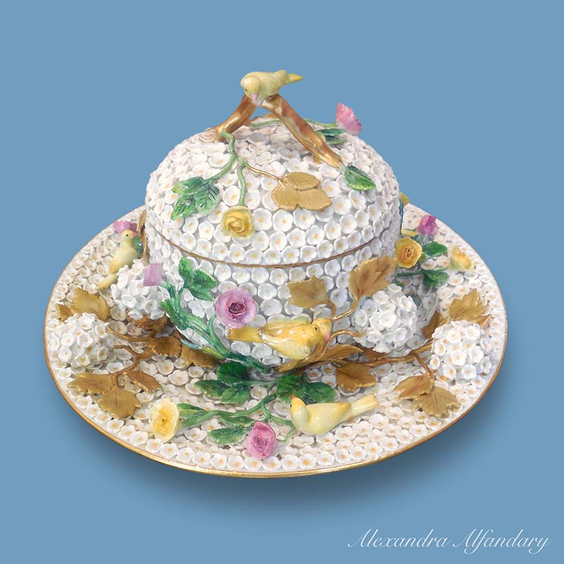 The Meissen porcelain eceuille is decorated with applied snowball blossom all over, gilded and green leaves, canaries sitting to gilded branch to lid and to sides of bowl and plate, Meissen crossed swords to base.