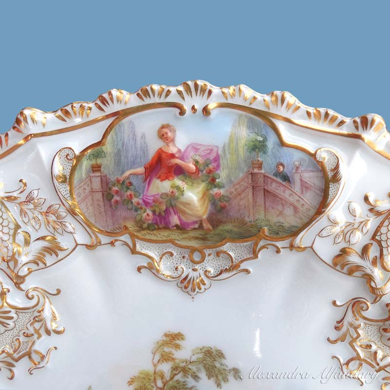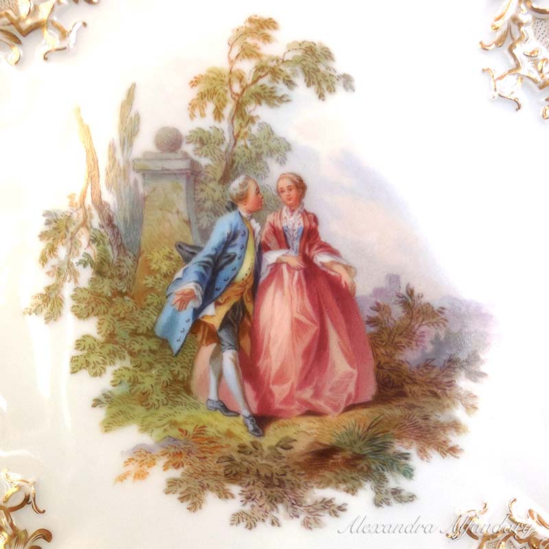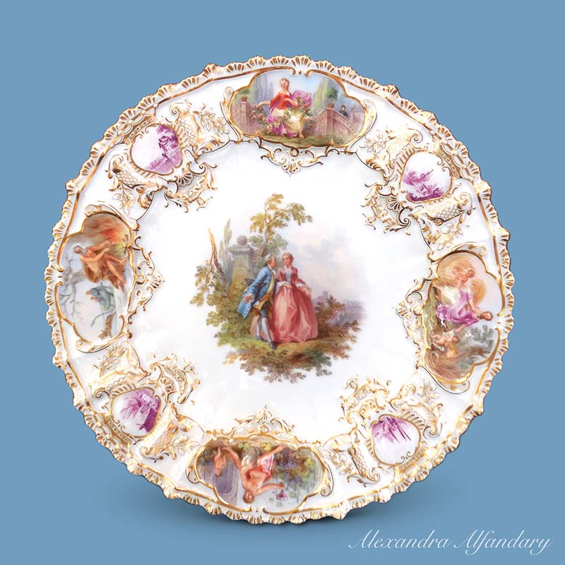 The plate painted with a central cartouches of lovers in garden landscape, the scalloped edges to plate with cartouches of various figures, topographical scenes in camaieu, blue cross swords to back of plate.
