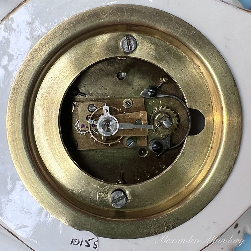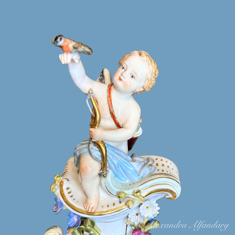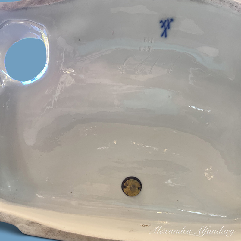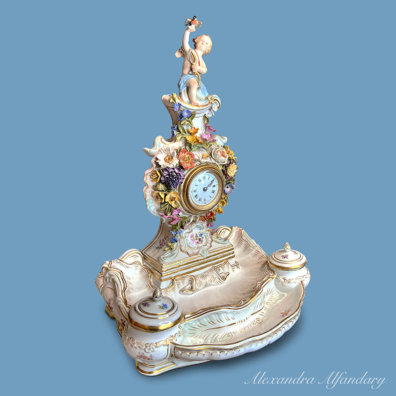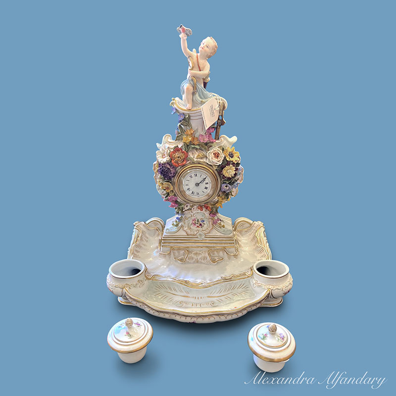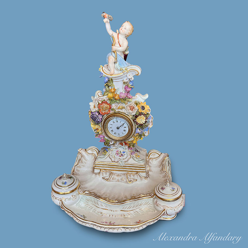 A very unusual Meissen porcelain desk clock combined with an inkwell with two inkpots, the clock with applied flowers and Putti to top holding a bird, the shell shaped inkwell and pots (one replaced) painted with scattered flowers, Meissen cross swords to base.