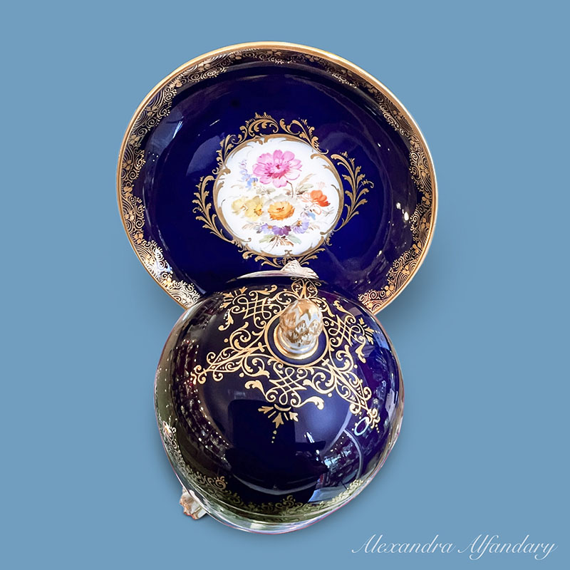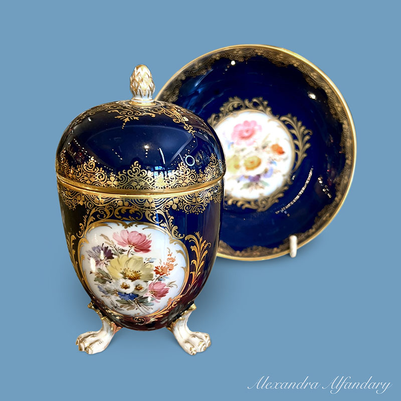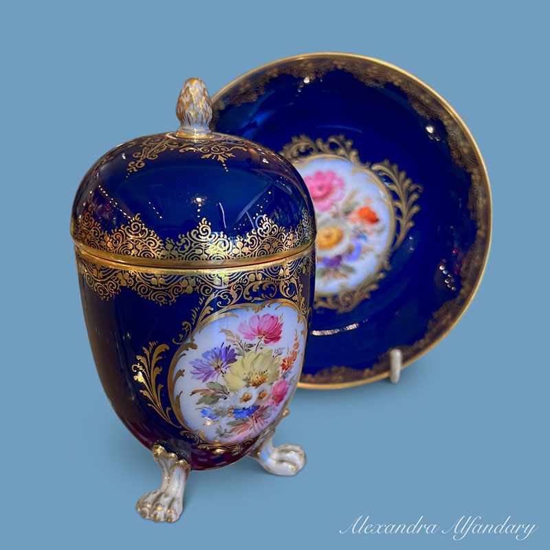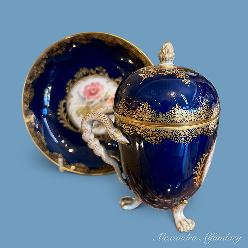 The Meissen porcelain chocolate cup and saucer with lid is painted with cartouche of flower bouquets, gilded scrollwork and stands on lion feet, Meissen cross swords to base.