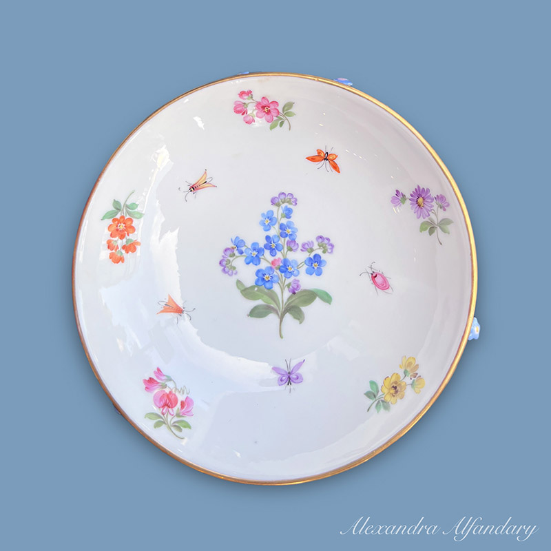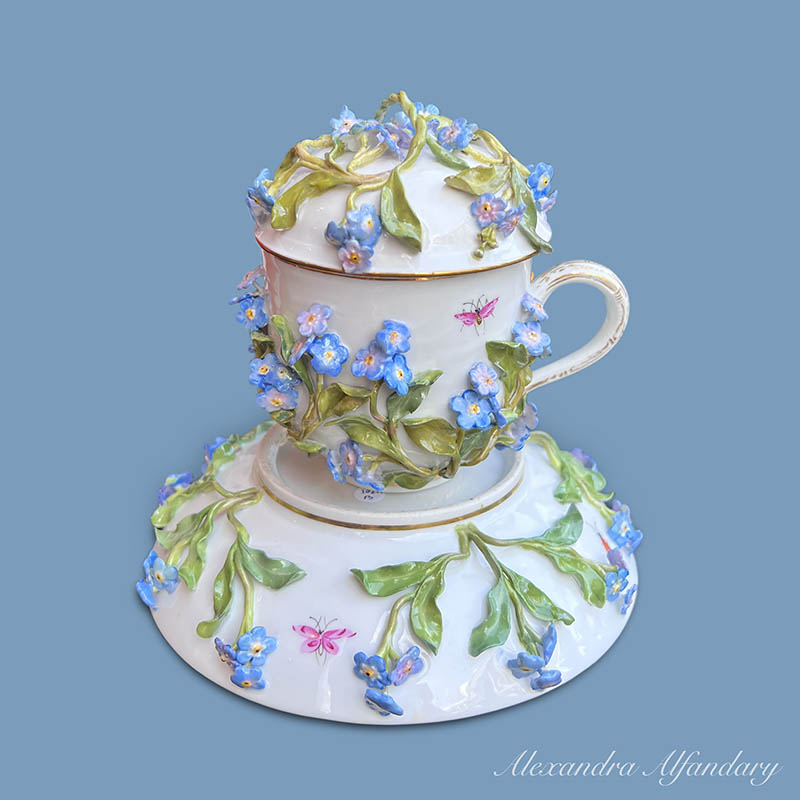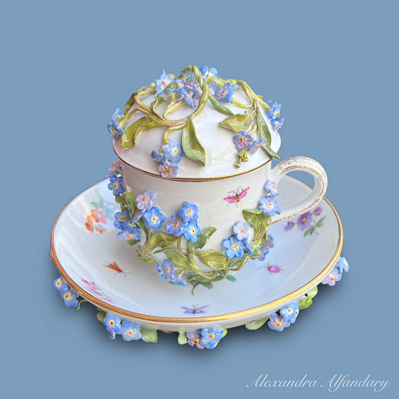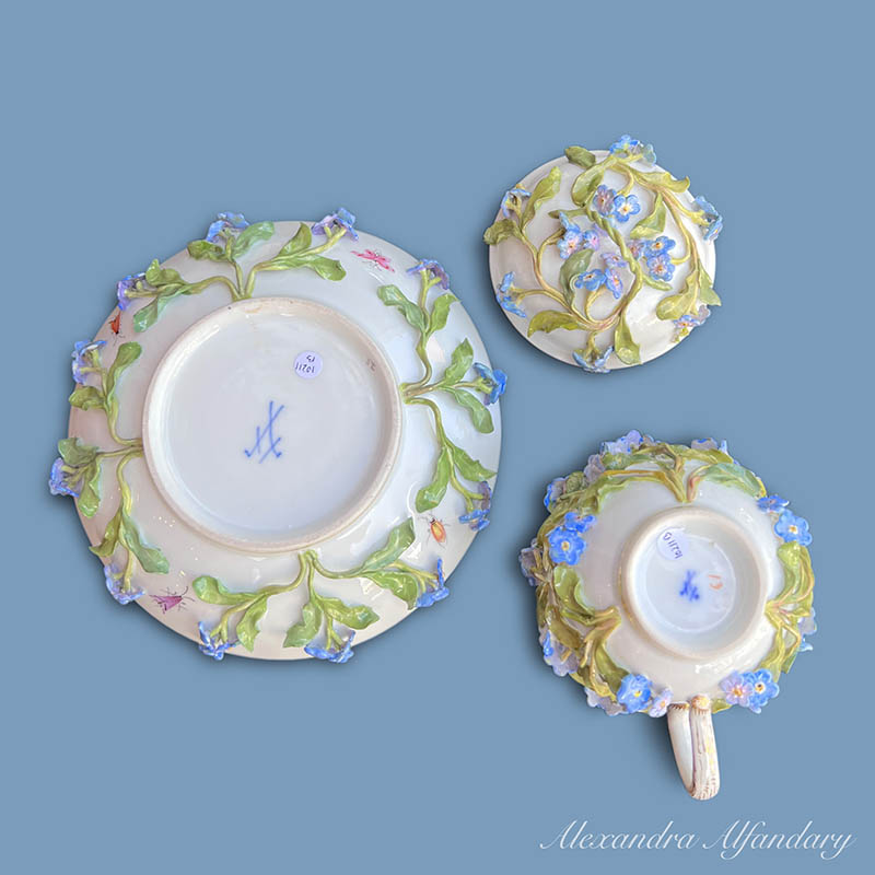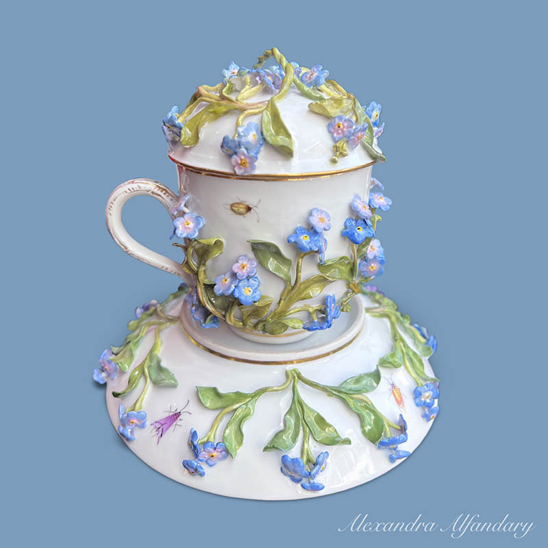Not to Forget – a collectable Meissen chocolate cup, saucer and lid, profusely decorated with applied forget me not flowers and leaves, painted bugs and butterflies to all, Meissen crossed swords to base.