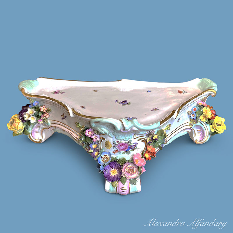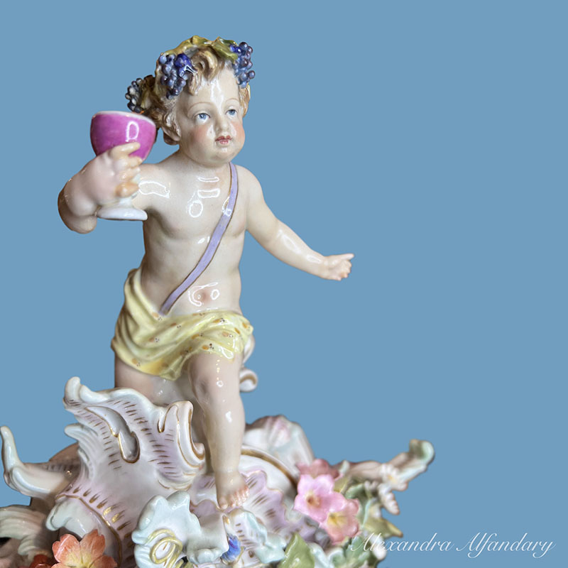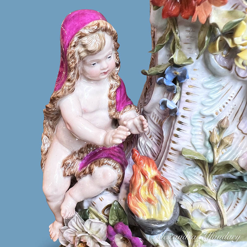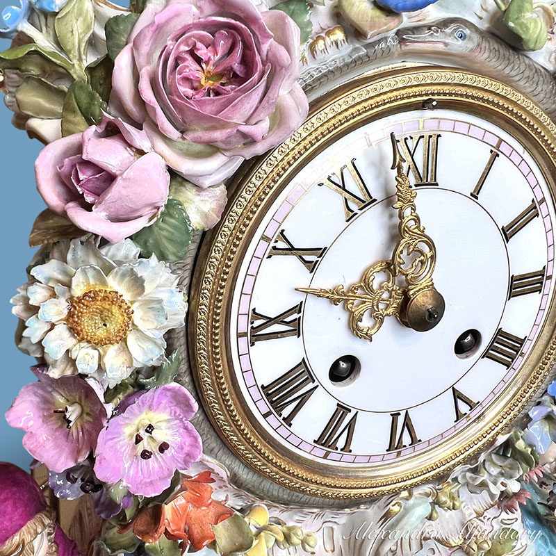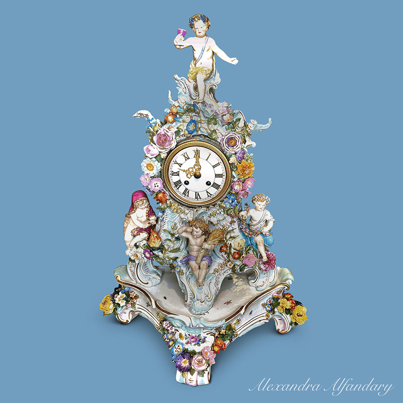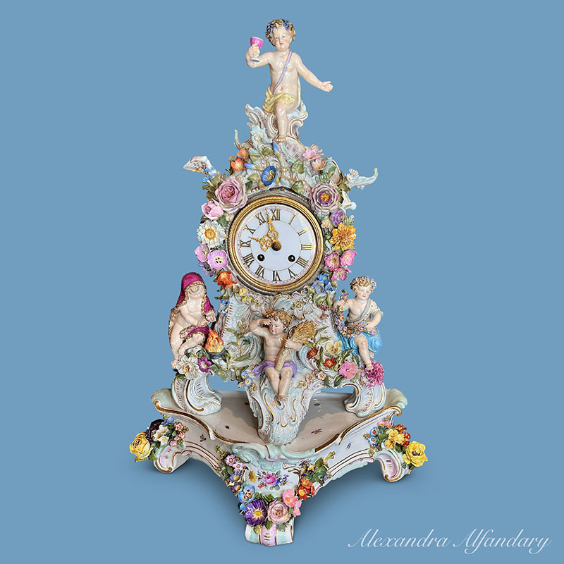 This highly decorative Meissen clock and stand with applied figures each representing a season, profusely applied flowers and leaves, painted bugs and butterflies to stand with scroll legs, decorated in the rococo revival style, after a model by J.J. Kaendler, Meissen cross swords to base of clock and stand.