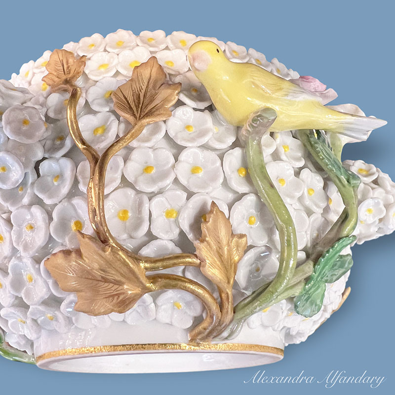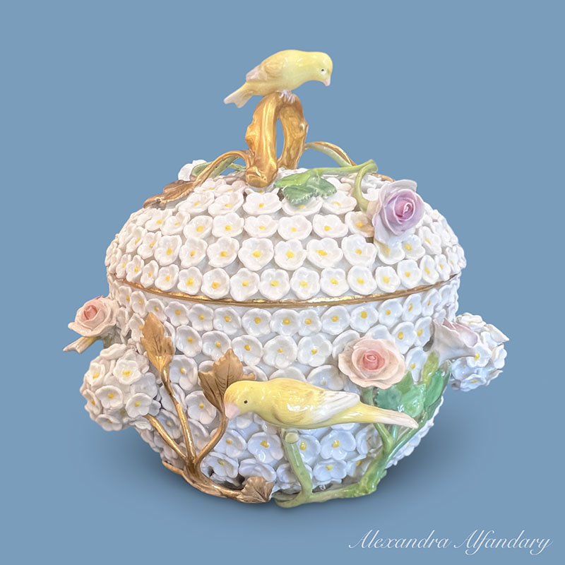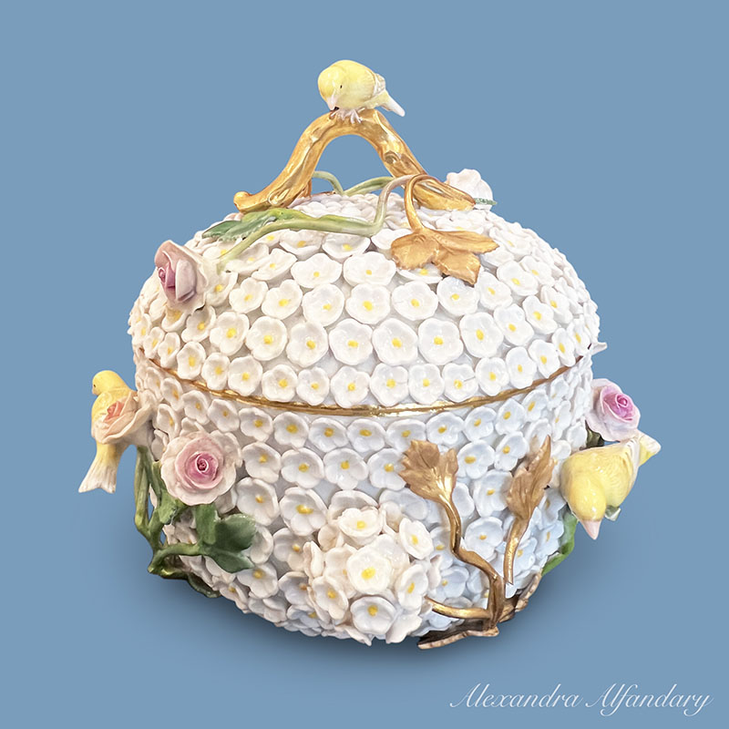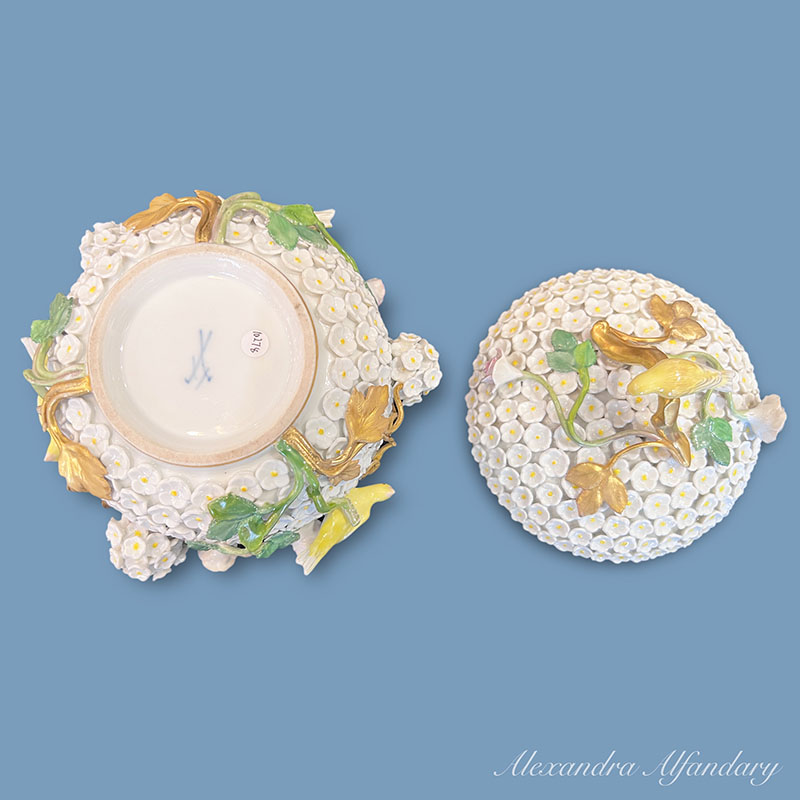 The Meissen porcelain sugar bowl and lid decorated profusely with snowball flower blossom, trailing roses and leaves with yellow canaries sitting on branches as well as handle to lid. J. J. Kaendler, the master modeller at the Meissen manufacture, created the delicate snowball decoration around 1739, which became very desirable and collected by royalty and the aristocracy throughout Europe. The featured snowball Meissen sugar bowl is of the 19th century, Meissen blue crossed swords to base.