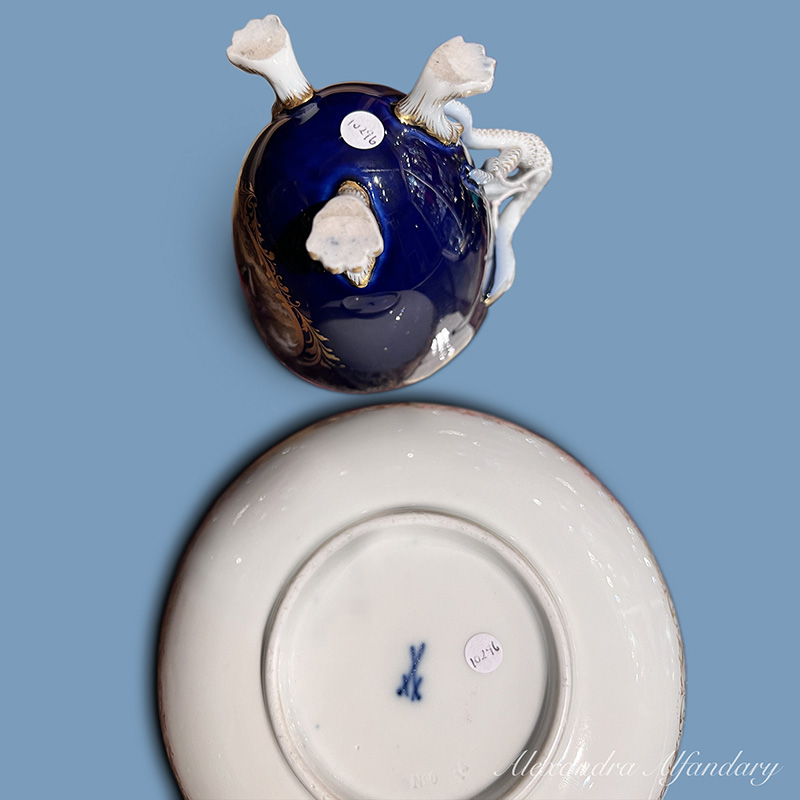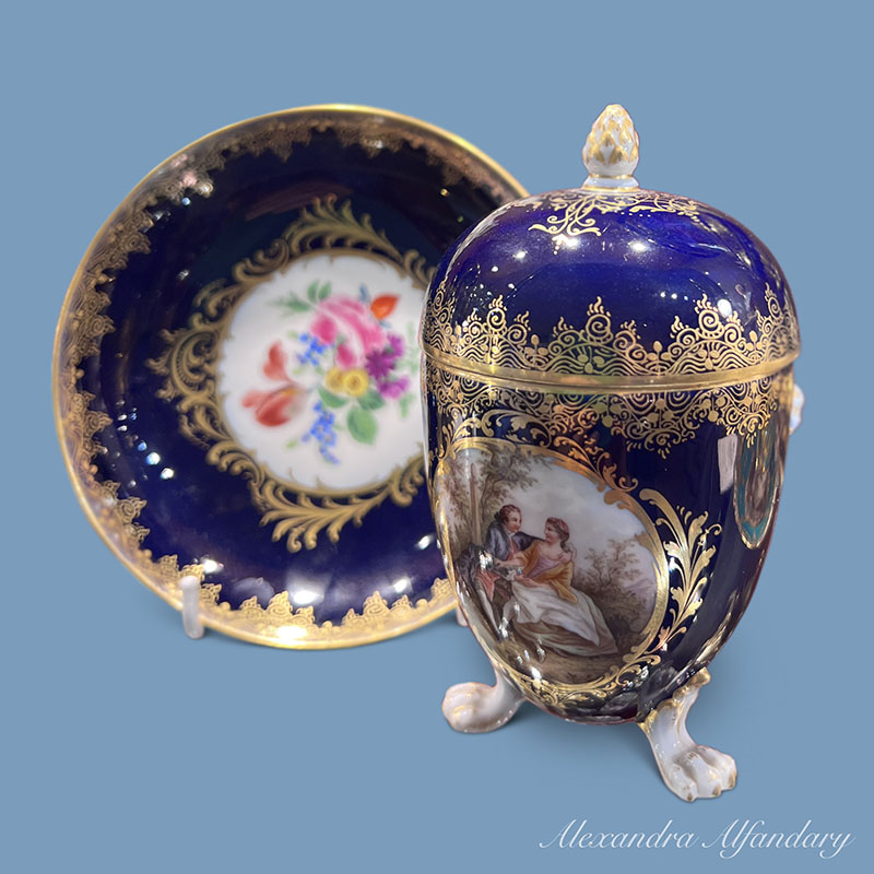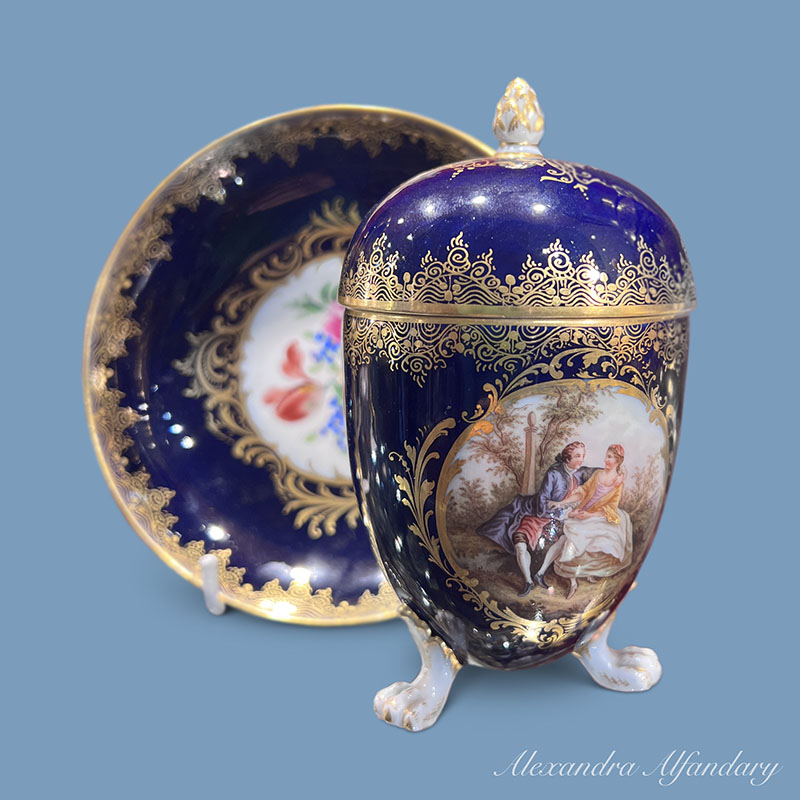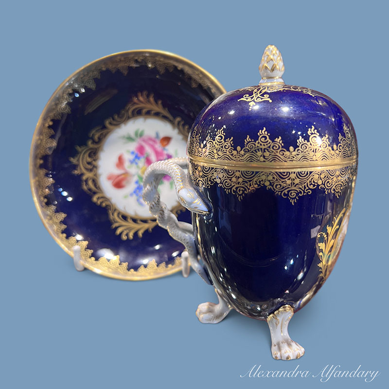 The Meissen porcelain chocolate cup, saucer and lid decorated to front of cup with romantic scene, flower decoration to saucer, scroll gilded decor all on cobalt blue ground, Meissen crossed swords to saucer and faint crossed swords to foot of cup.