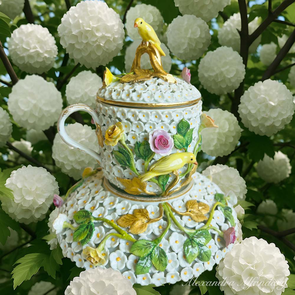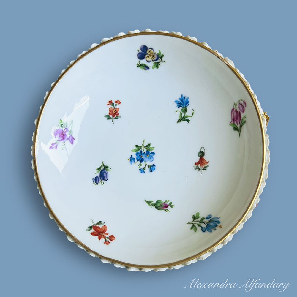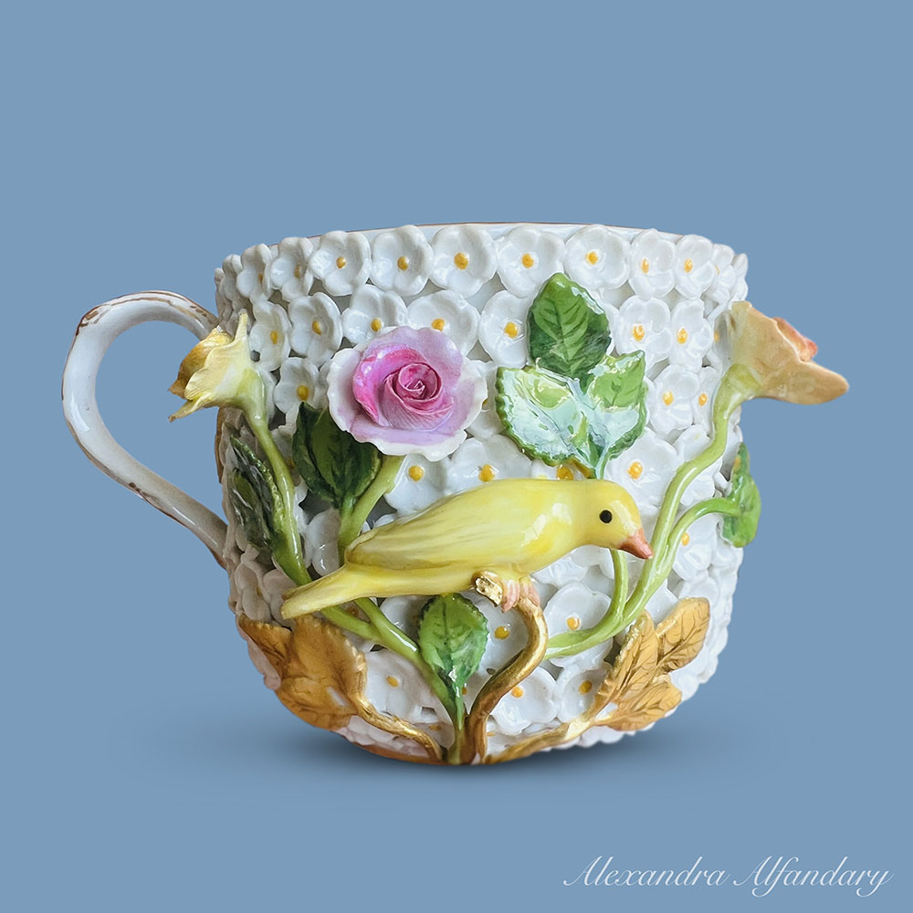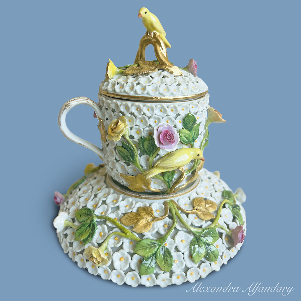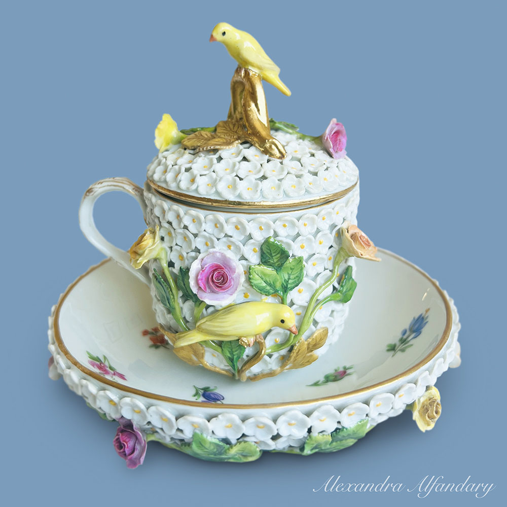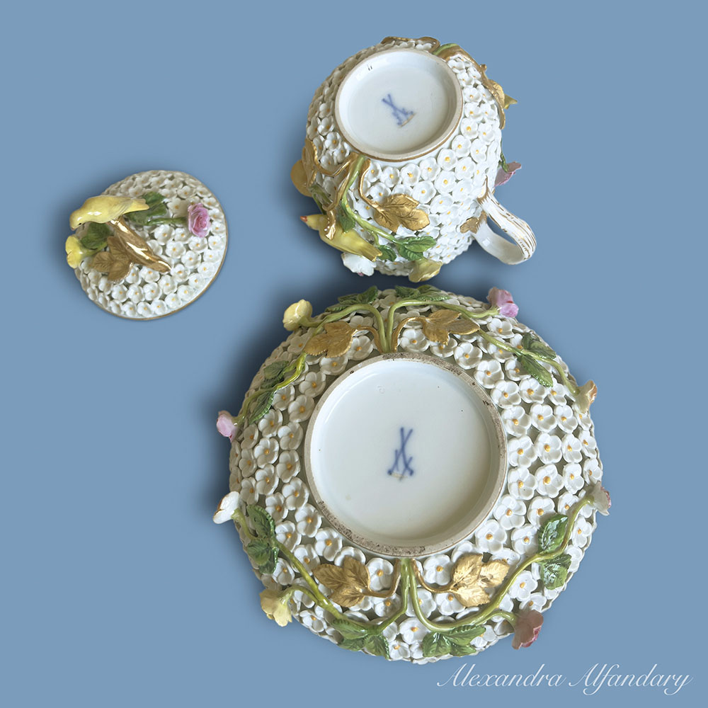 The cup and saucer decorated with snowball blossoms, polychrome flowers and canaries. The saucer with painted scattered flowers, blue Meissen cross swords to base.