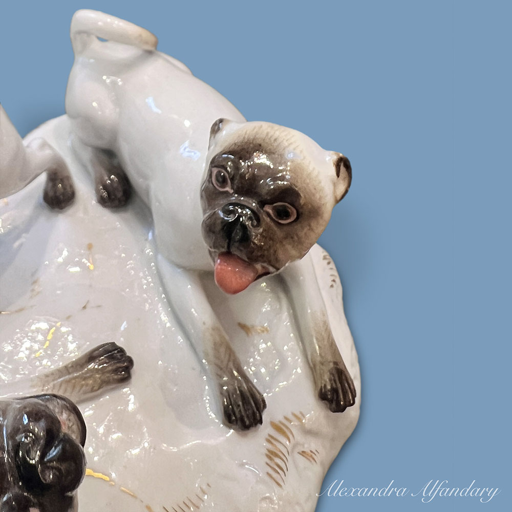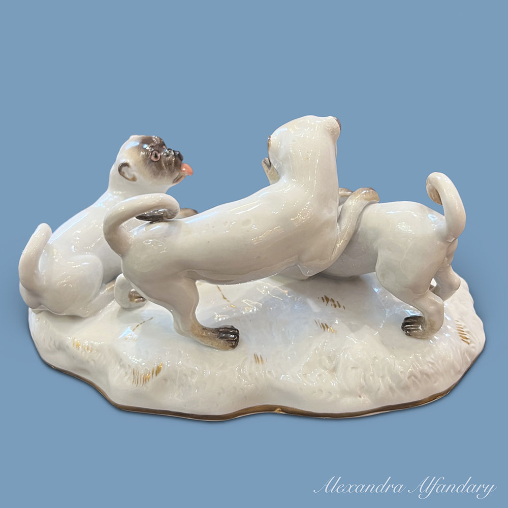The Meissen porcelain group of three pugs at play dates from the late 19th century, the model by J. J. Kaendler, the well modelled features of the pugs animated and life like, Meissen blue crossed swords to base.