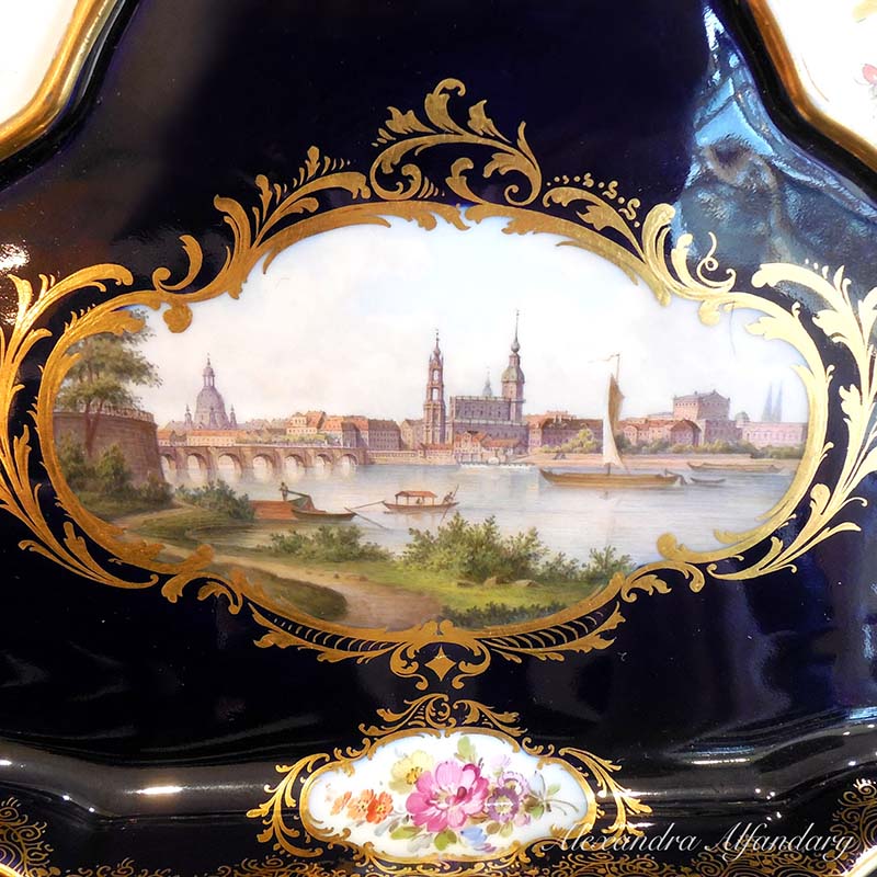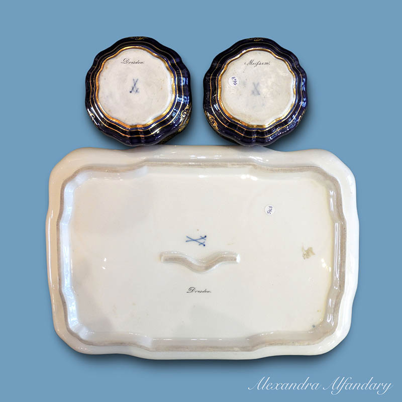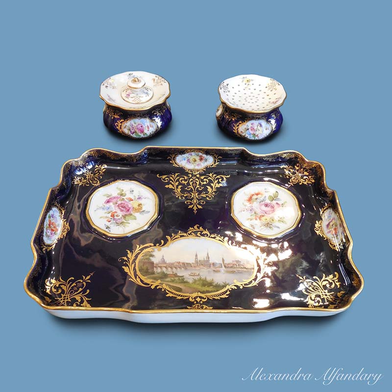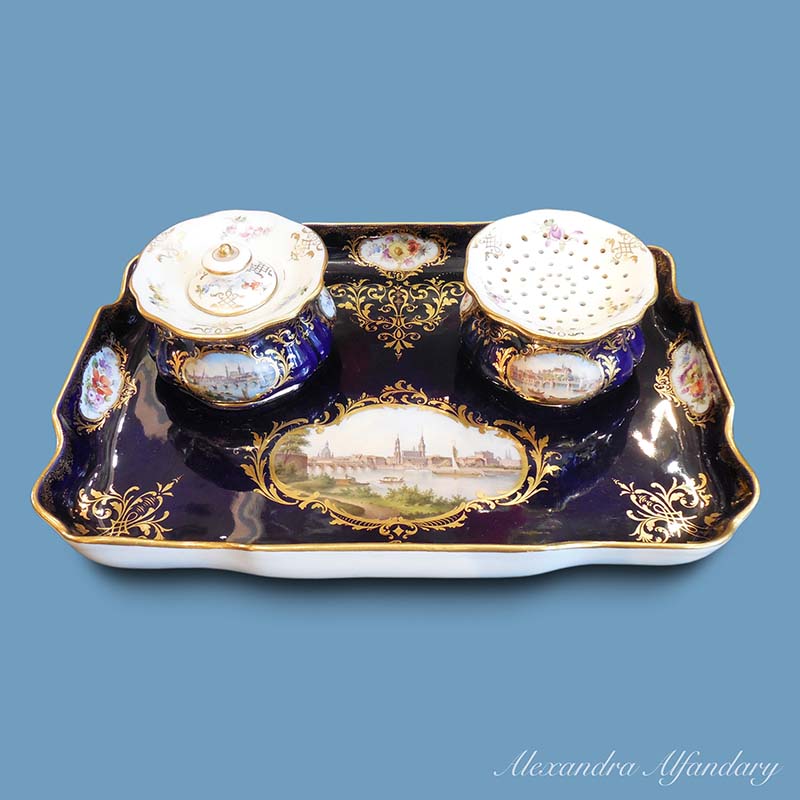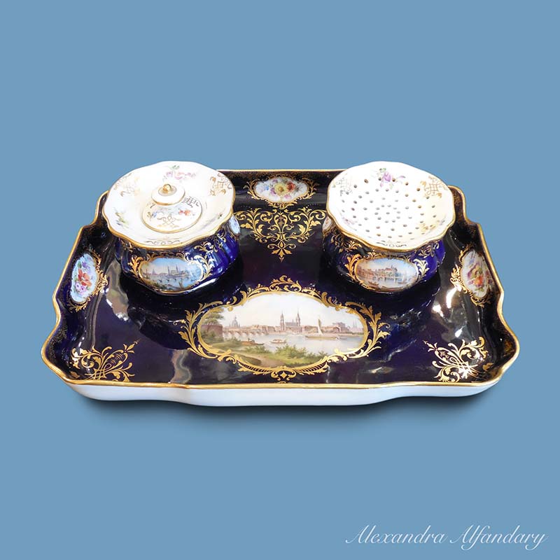 The cobalt blue Meissen porcelain inkwell is beautifully decorated in minute detail with topographical scenes of Meissen and the town of Dresden, both pots and tray entitled to base with their topographical scenes, the tray finely painted with a view of Meissen, cartouches of flowers and and decorative gilding. The inkpot with lid and the sander as companion.