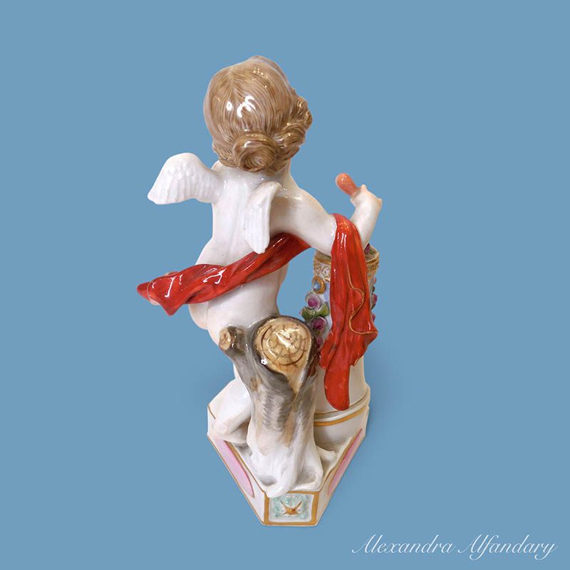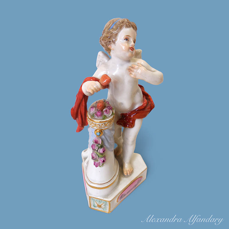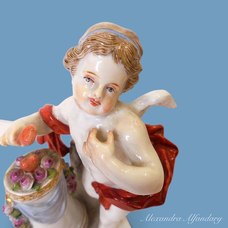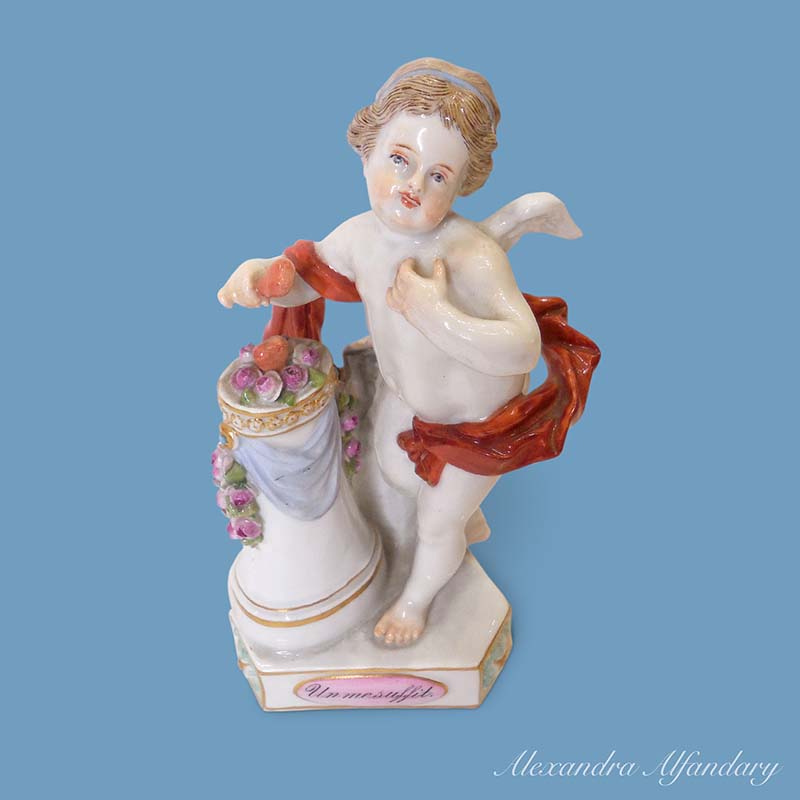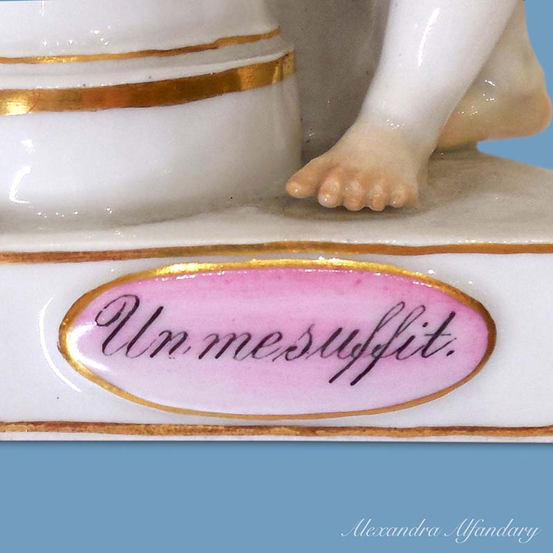 This Cupid is from a charming series of Putti/Cupids with mottos in French, The French language being the language of the Court. The inscriptions read as to the subject’s action. This cupid/putti has the inscription: Un me suffit (one is enough), with one heart being discarded by the putti to show that one love (one heart) is enough.