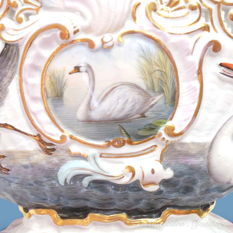 A very decorative Meissen porcelain wine cooler, with flower designed pierce upper band, highlighted in gilding, swans and heron to both sides, with a cartouche of swan to front, pink shell motive to base.
