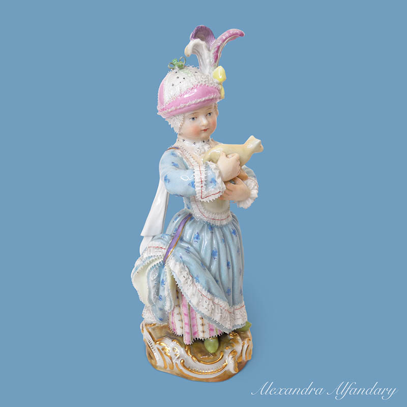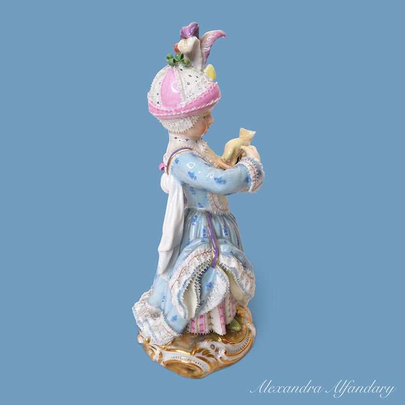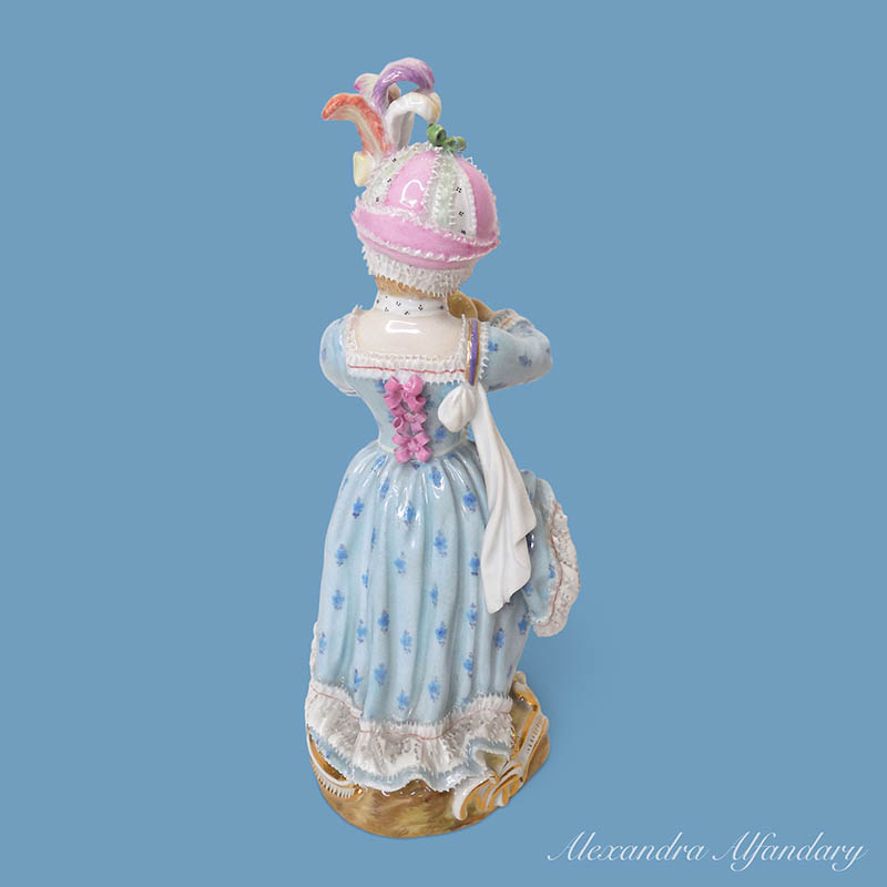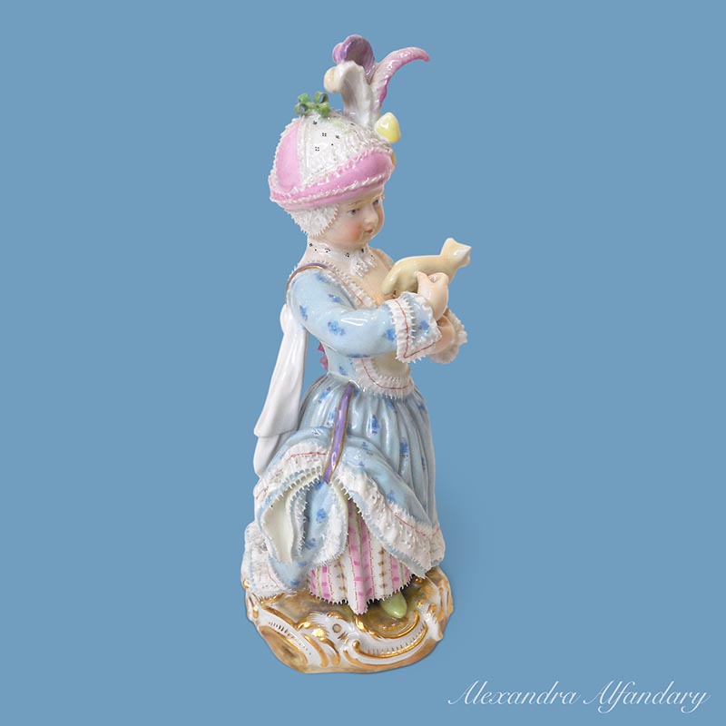 The little girl is elaborately dressed in a blue dress ruffled at her side with her pink skirt showing, the back of dress with pink bows, lace border to dress and cuffs, a bonnet with three feathers and lace topped with a green bow, all on a light brown coloured base with highlighted gilding to white scroll decor, the toy lamb held by the little girl in both arms.