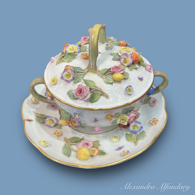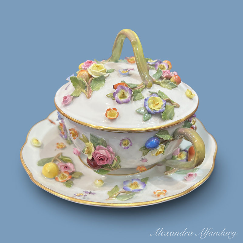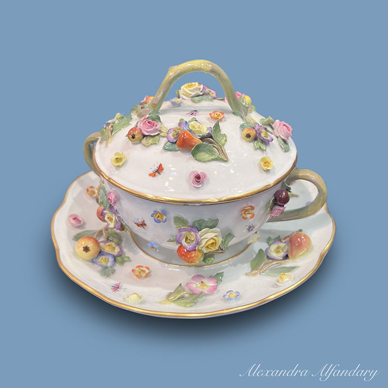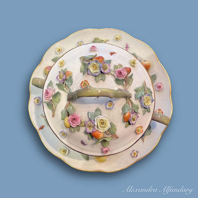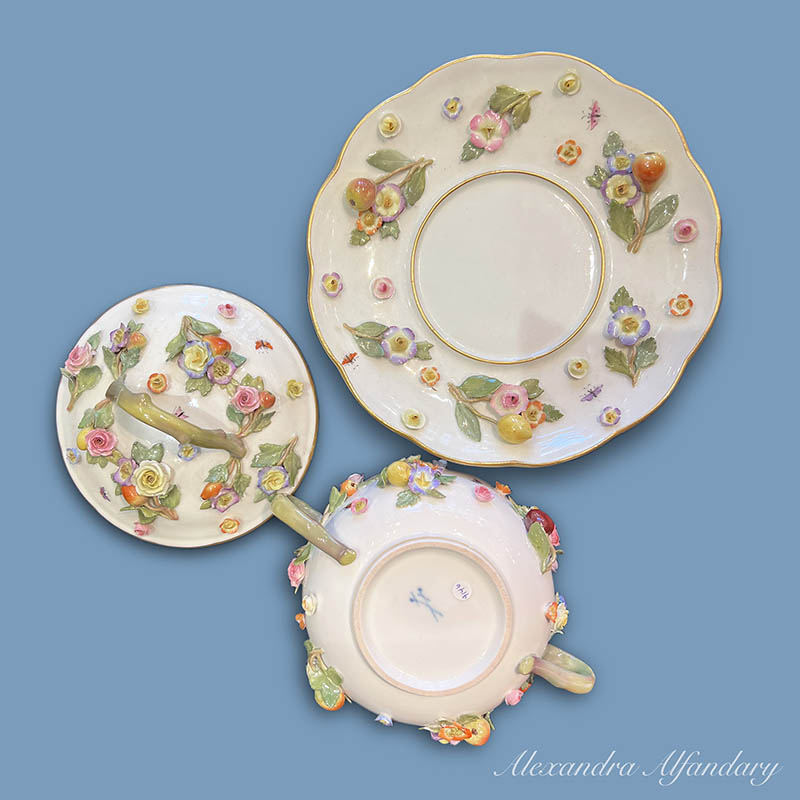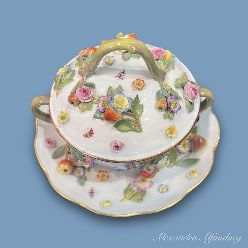 The Meissen porcelain dish, cover and saucer is decorated profusely with applied polychrome flowers and fruit with painted bugs and butterflies, green handles to sides and cover. Meissen blue crossed swords to base.