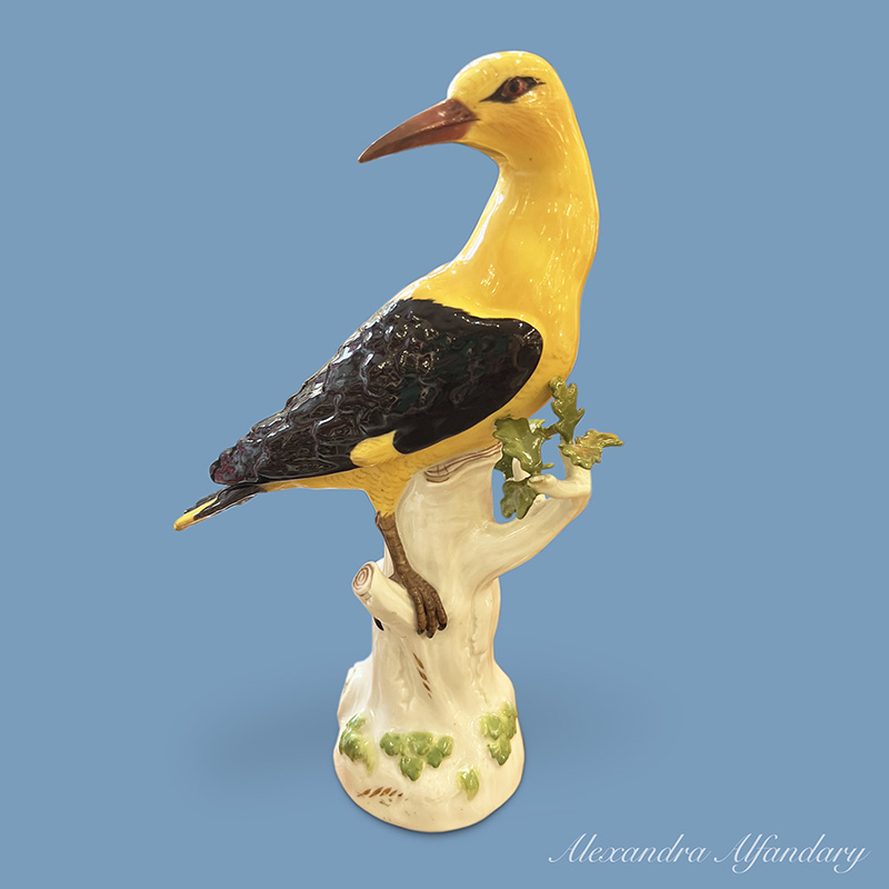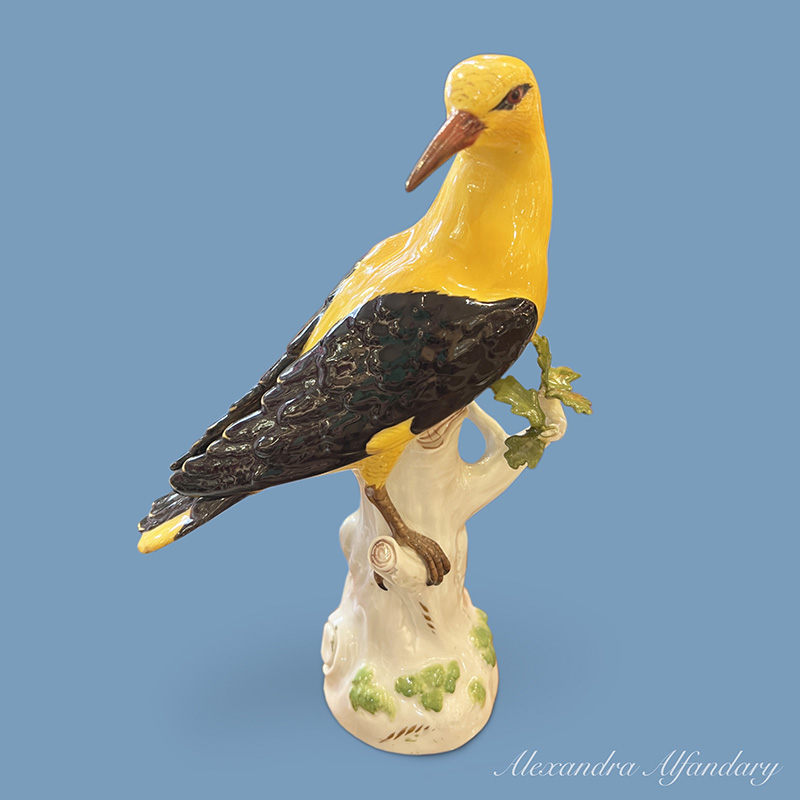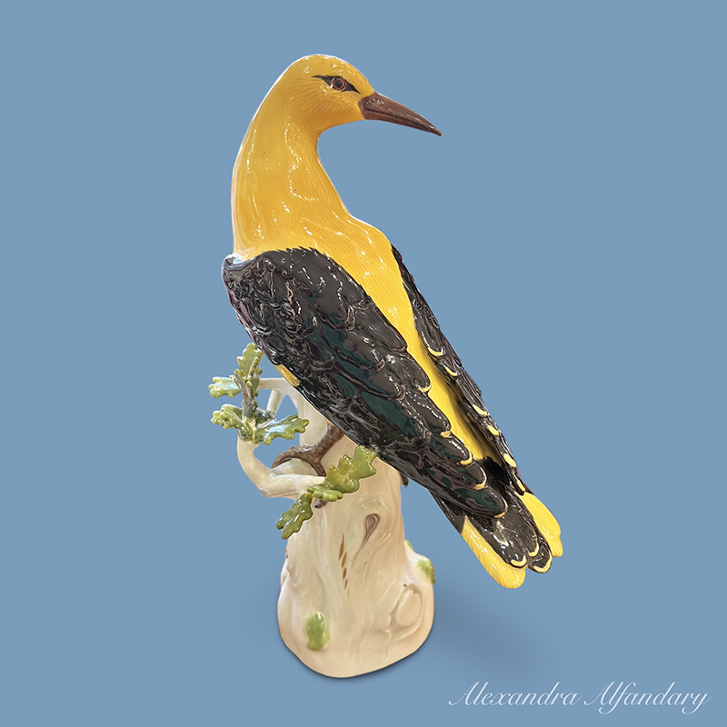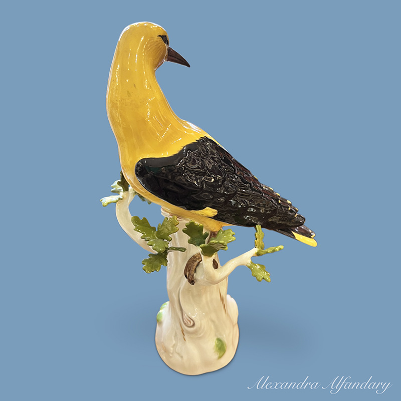The Meissen golden oriole sitting on tree trunk looking over his right shoulder with well modelled wings and yellow body, Meissen crossed swords to base.