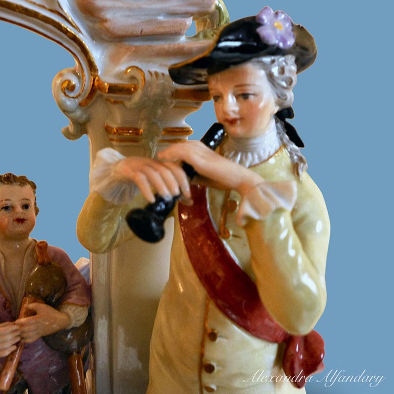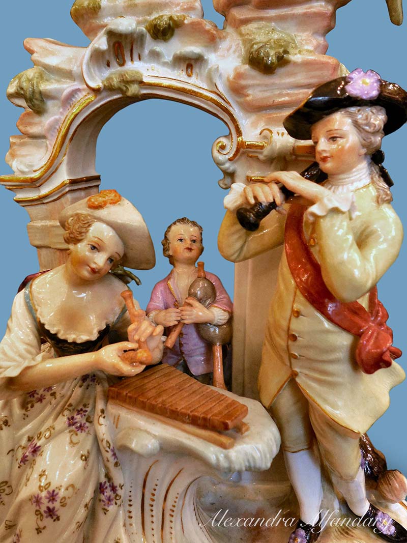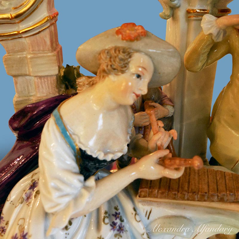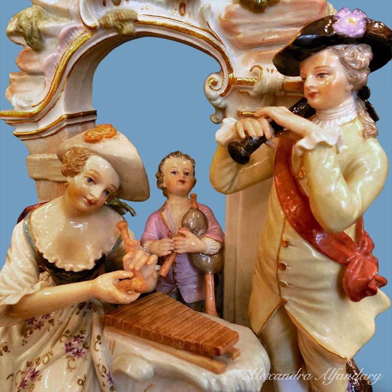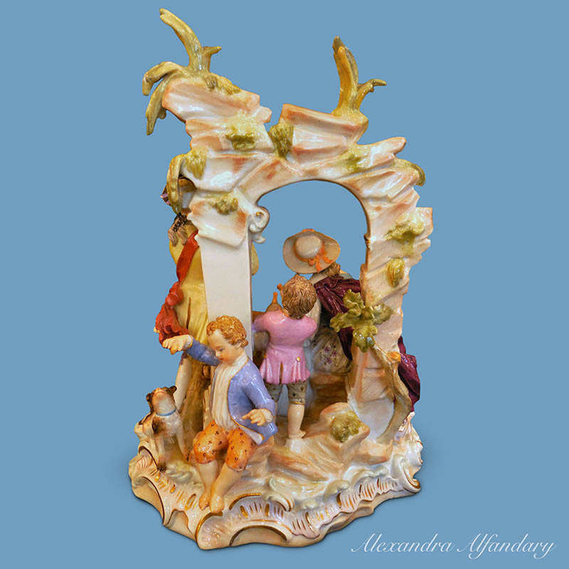 This charming Meissen porcelain group with three figures playing musical instruments, another figure sitting at the back playing with a dog, the group sitting underneath an arch. The modelling of the late 19th century group shows Meissen modelling at its best, soft, natural colouring and decoration, Meissen crossed swords to base, Meissen c. 1870-80.