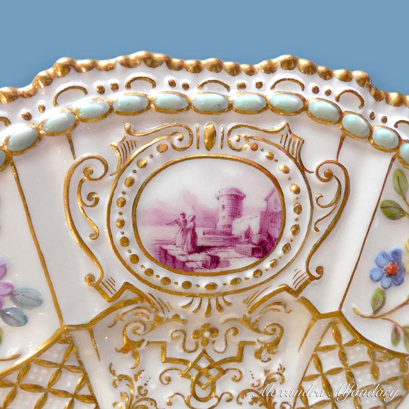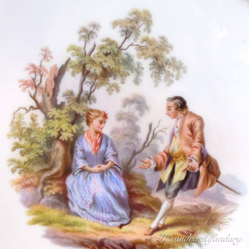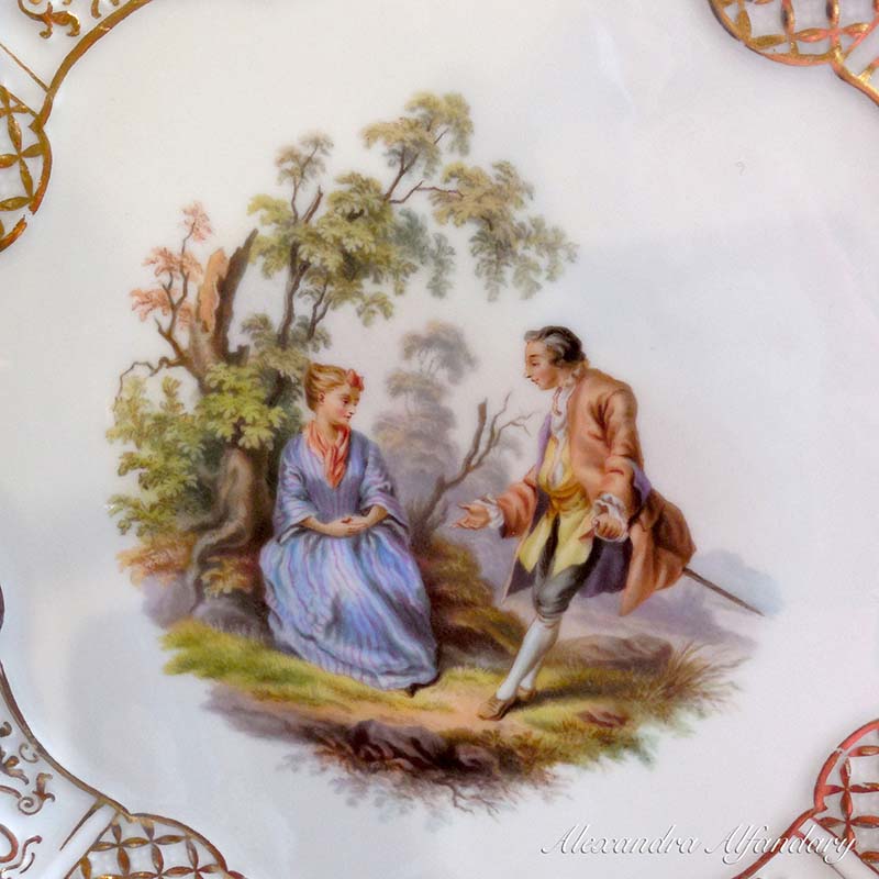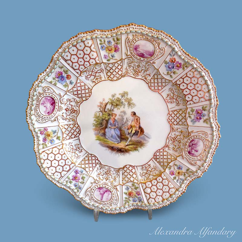 A well decorated and collectible Meissen plate with raised decoration and highlighted gilding, cartouches with finely painted scenes in puce to rim, the centre of plate with romantic scenes, Meissen blue crossed swords to base.