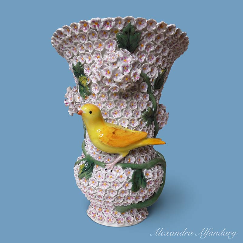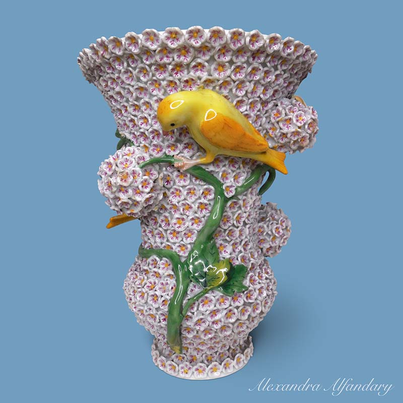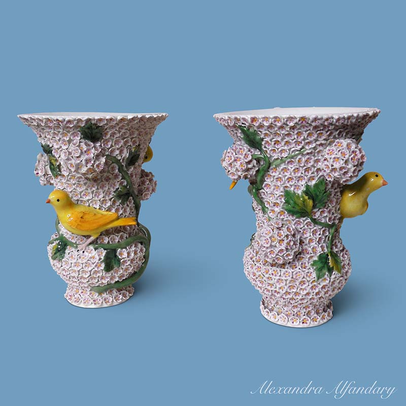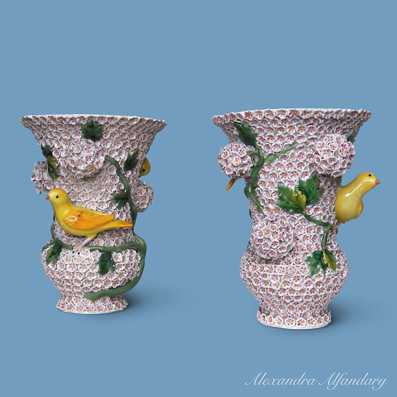 The pair of Meissen campagna shaped Vases are decorated all over with applied blossoms of Schneeball flowers (snowball flowers), leaves and yellow canaries, blue crossed swords to base, Meissen c. 1890.