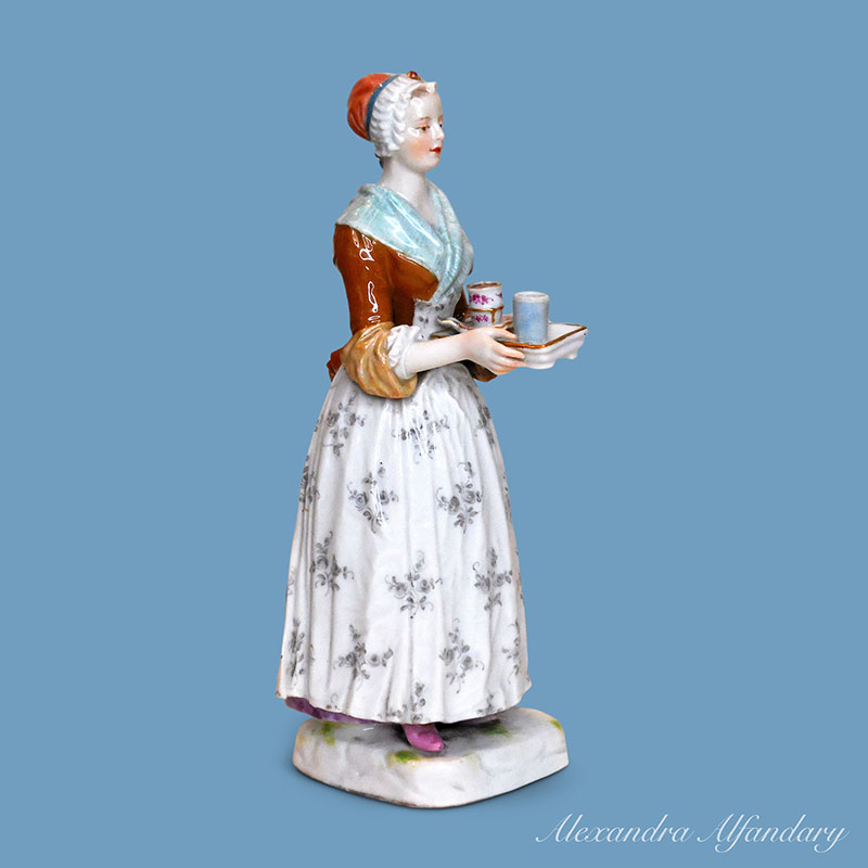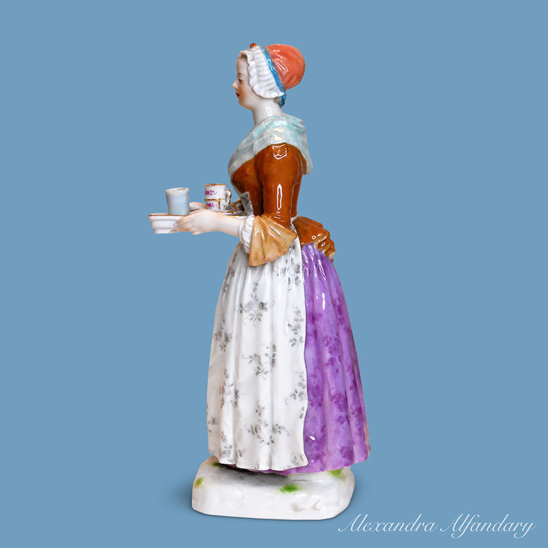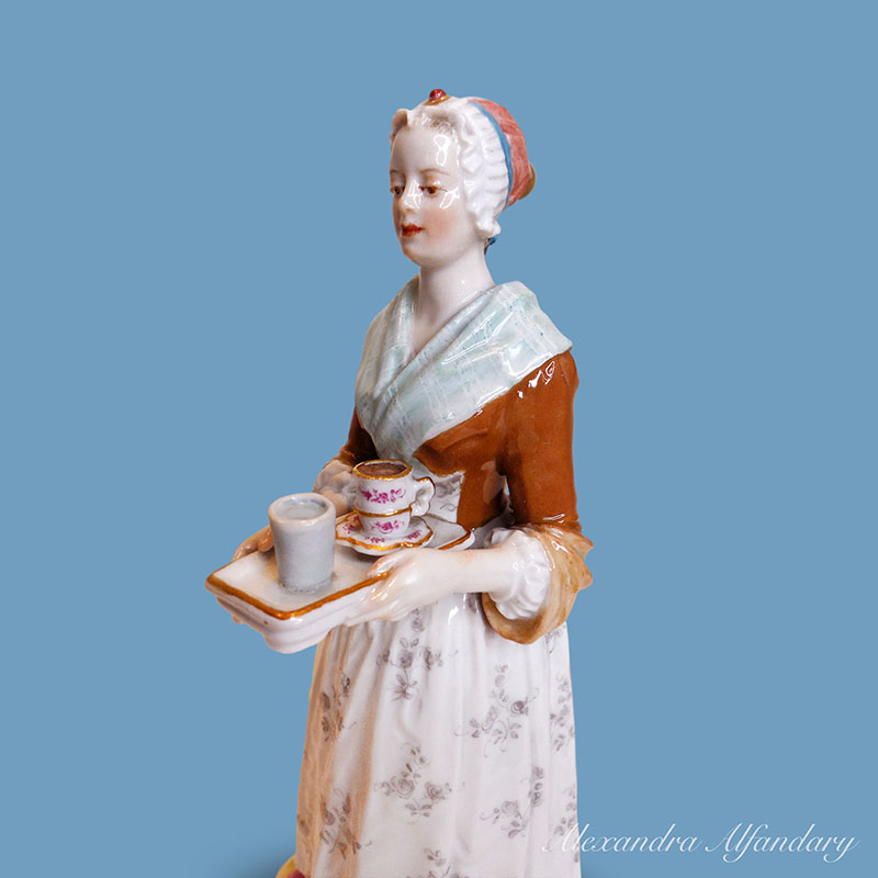A charming Meissen porcelain figure of a young servant girl serving holding a tray with trembleuse cup filled with hot chocolate. The modeller Paul Helmig at the Meissen manufacture created the Chocolate girl around 1901 and is based on a famous painting by the Swiss painter Etienne Liotard. The painting now hangs in the Gemaelde Gallerie Alte Meister in Dresden. Meissen crossed swords to base, Meissen c. 1901.