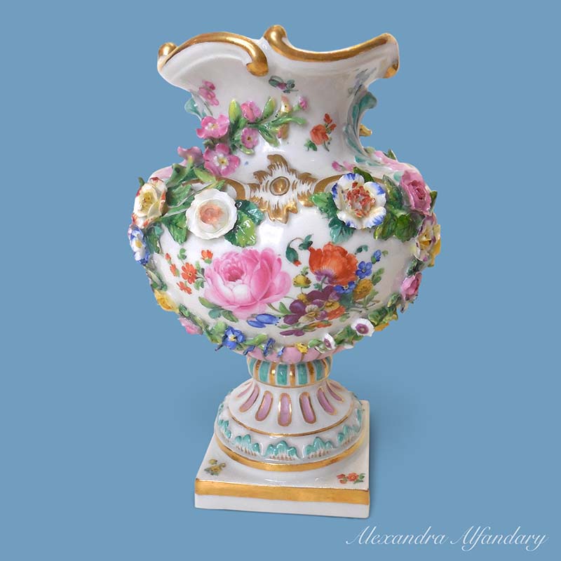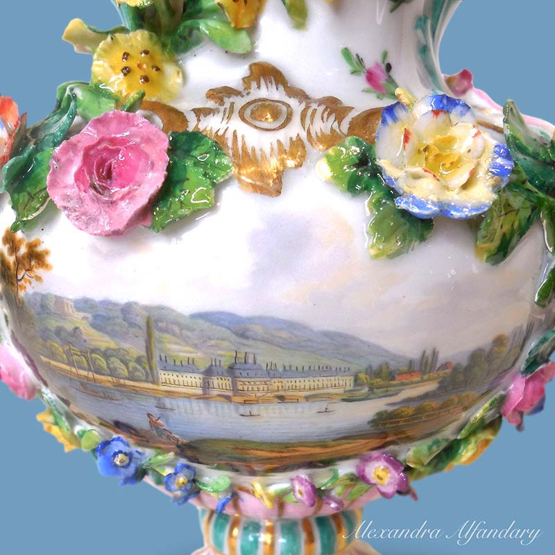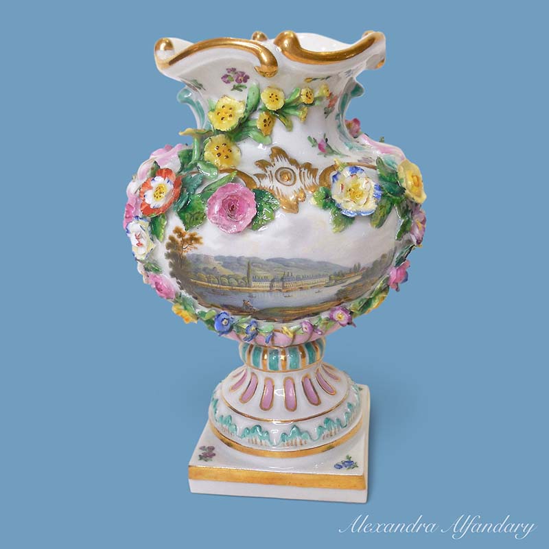 This small Meissen porcelain vase is decorated finely with a river scene and castle to front, painted flowers to back, the vase decorated all over with applied and painted polychrome flowers, gilded rim to top, pink and blue decoration to foot, Meissen crossed swords to base.