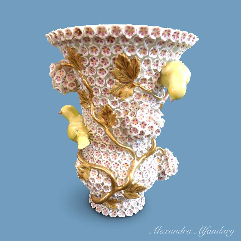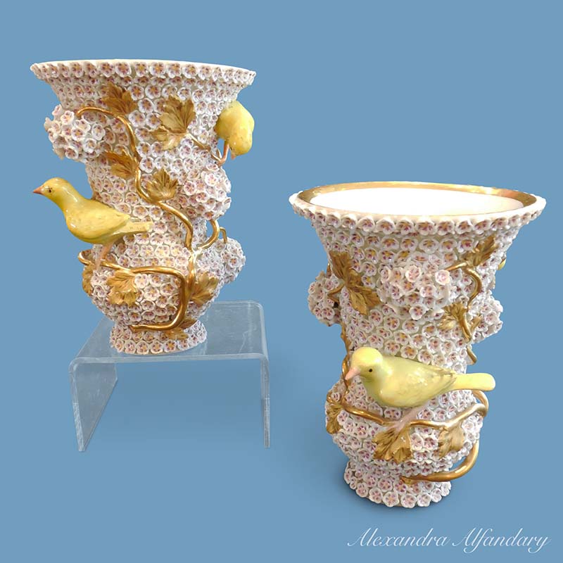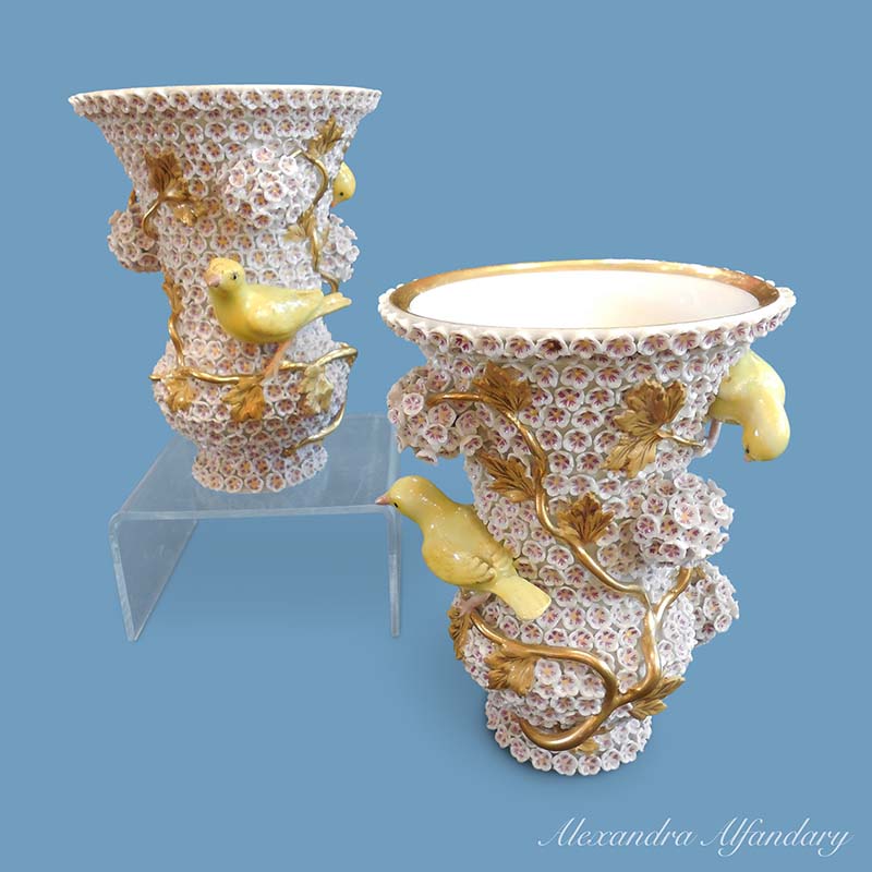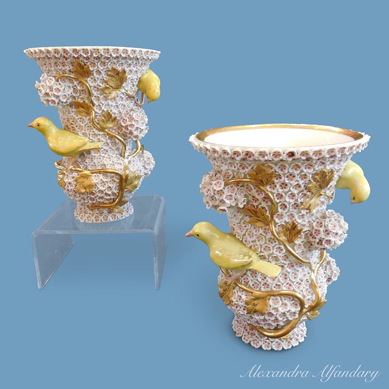 The campagna shaped vases after a model by Leuteritz are decorated with applied snowball blossom and yellow canaries, gilded leaves on gilded trailing stems with each blossom applied by hand. These Meissen vases show the expertise of the Meissen manufacture.