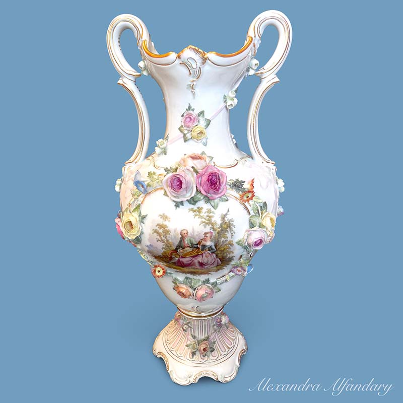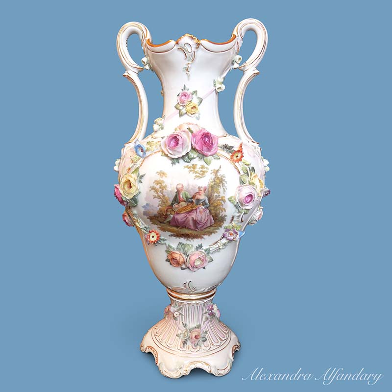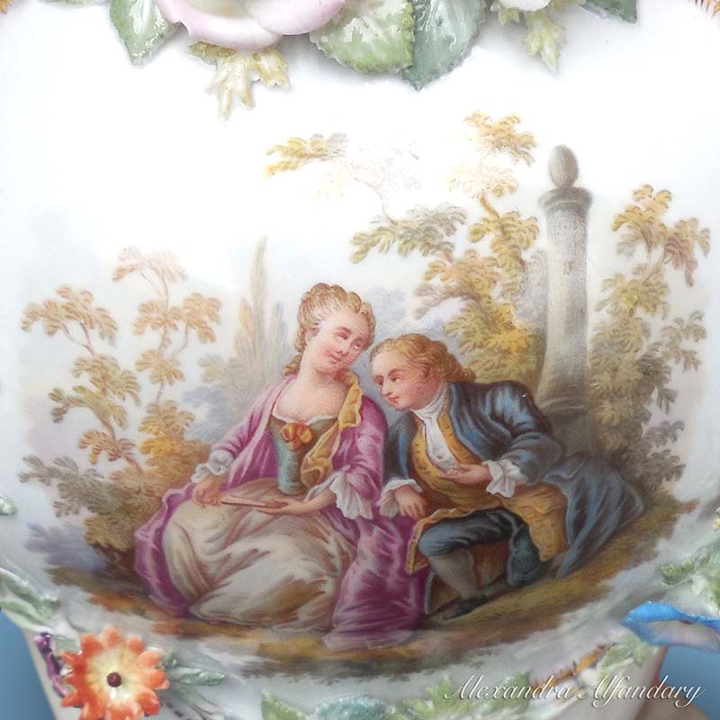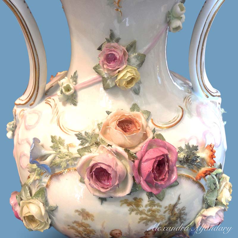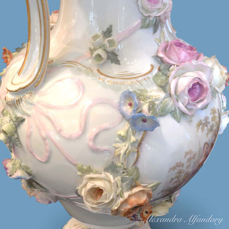 The Meissen porcelain vase is after a model by Ernst August Leuteritz with unusual trailing pink ribbons in relief, finely painted romantic scenes to back and applied summer flowers to both sides, the handles rim and stand highlighted in gild, Meissen crossed swords to base.