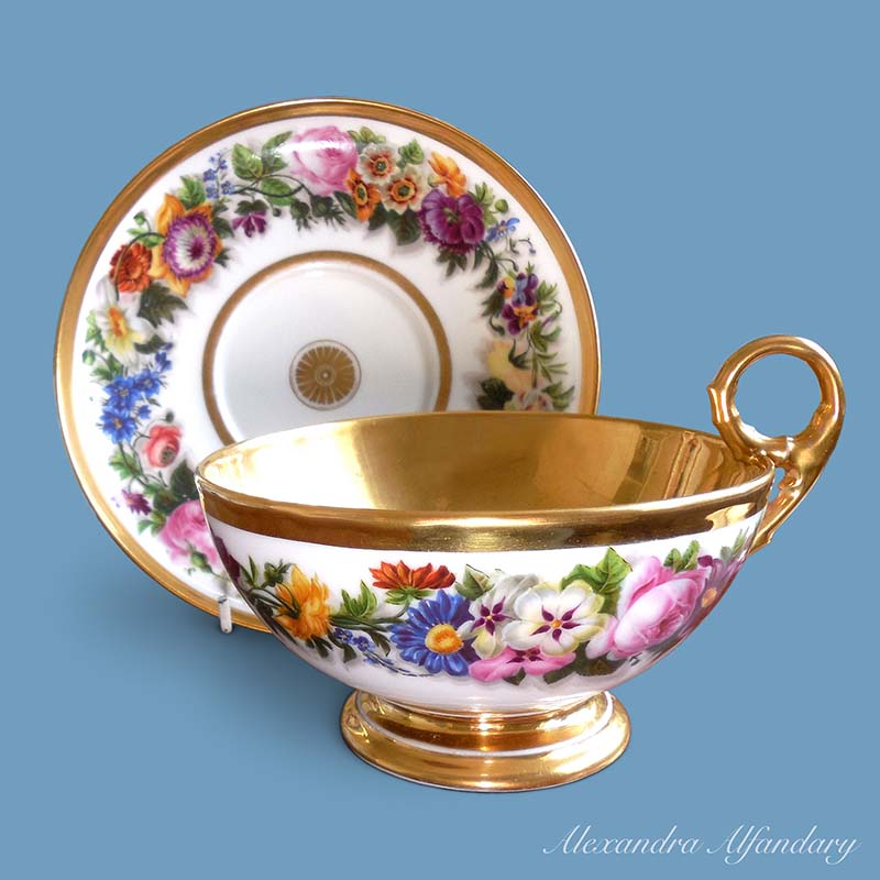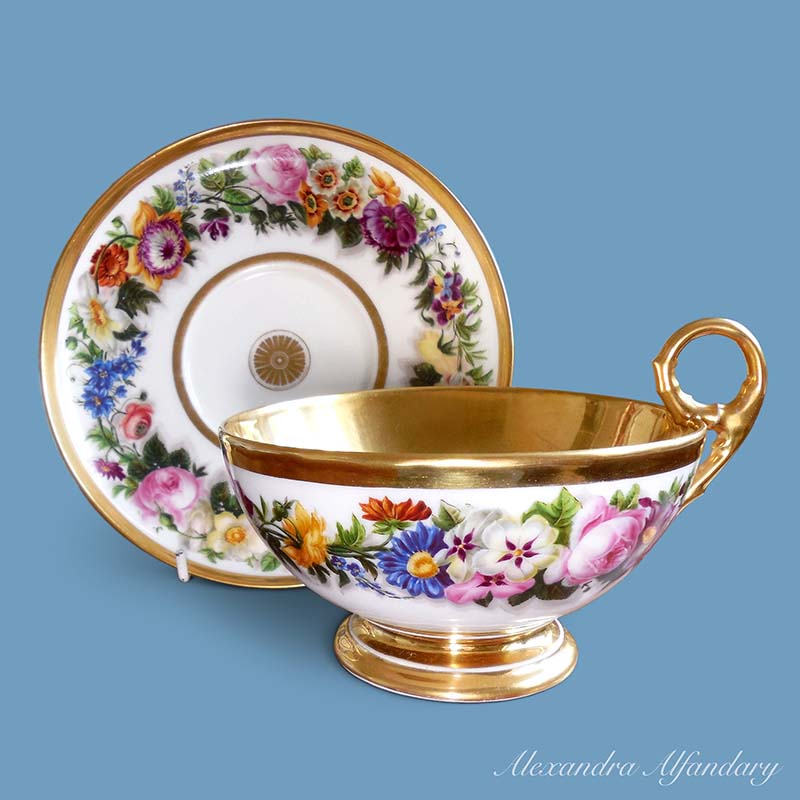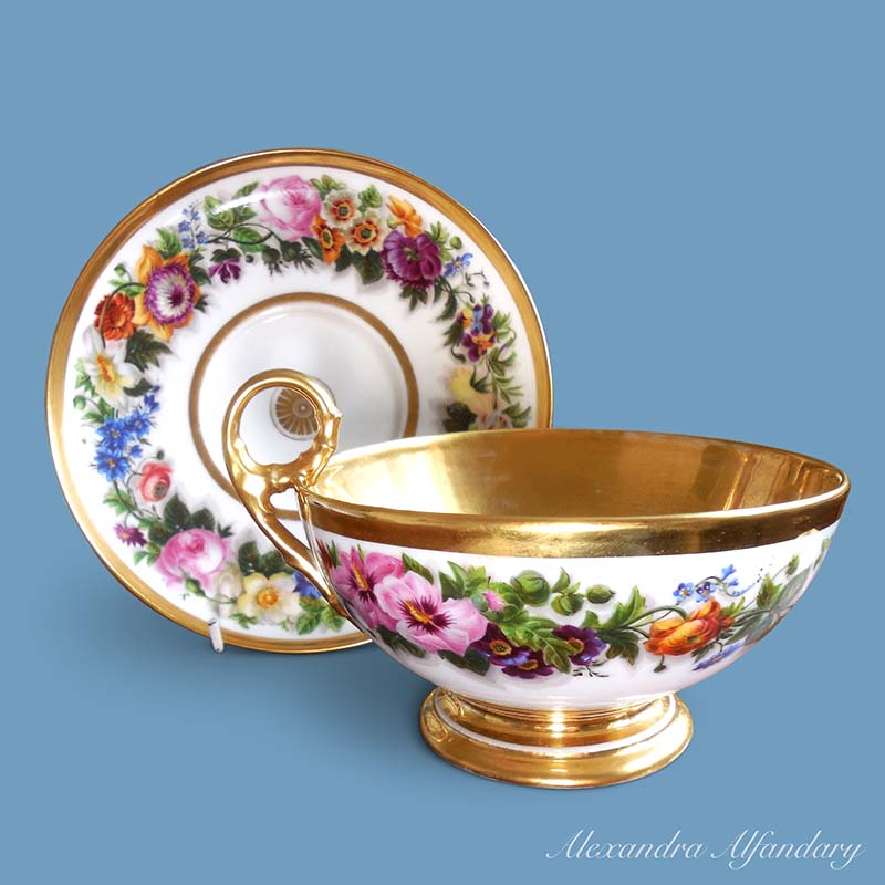 The cup and saucer are painted in beautiful detail with roses and summer flowers, all on polished gilded ground with gilded leaf design to interior of cup, a scroll handle leaning into the interior of the cup.
