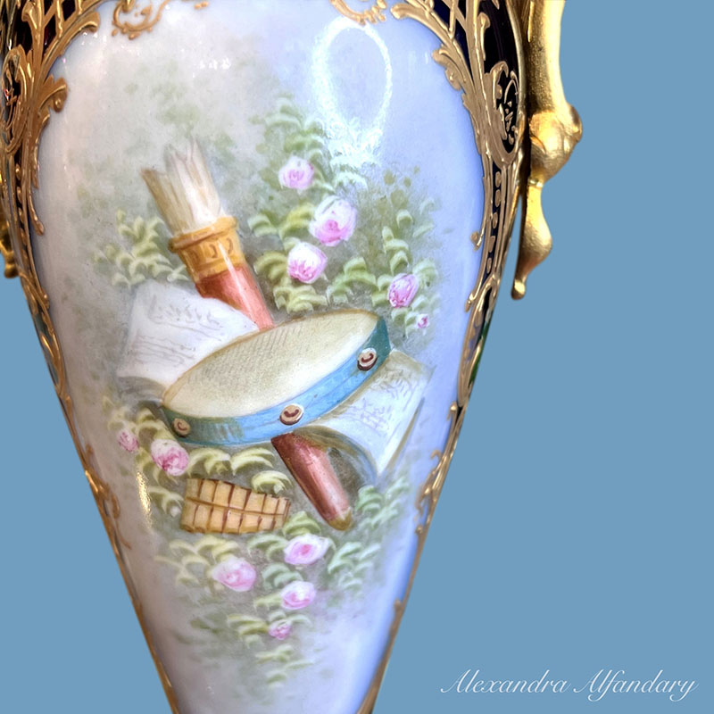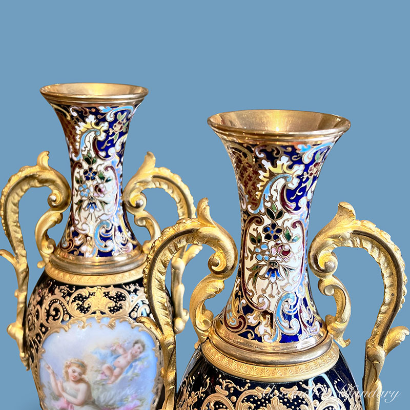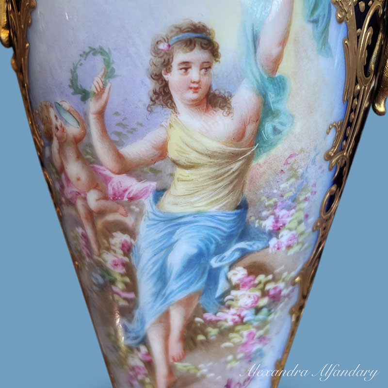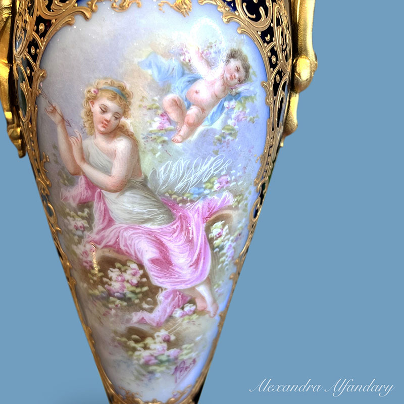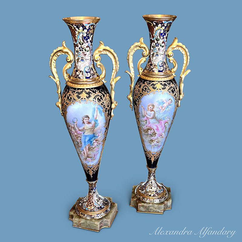 The pair of slender shaped vases, gilt metal mounts, champlevé neck and base, onyx stand, the porcelain body decorated in the Sèvres style with females and putti at play signed T. Berg, the back painted with pipes and tambourine, raised gilded decoration to porcelain.