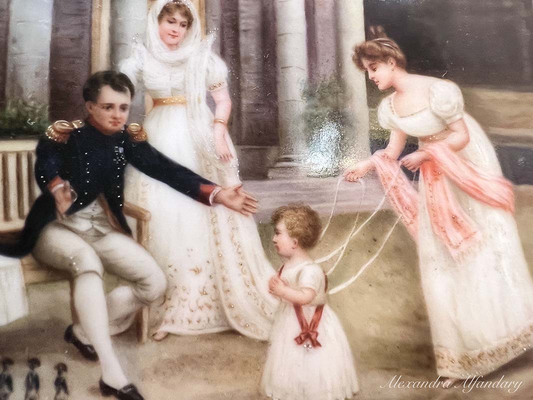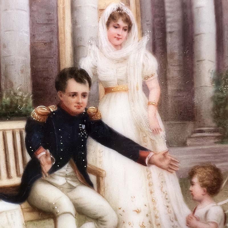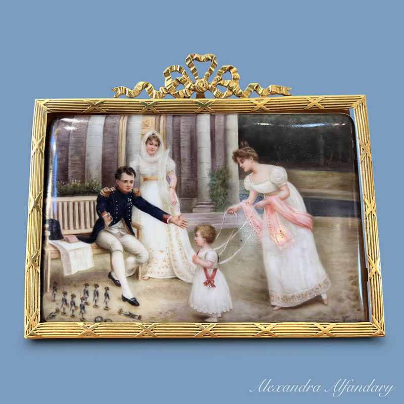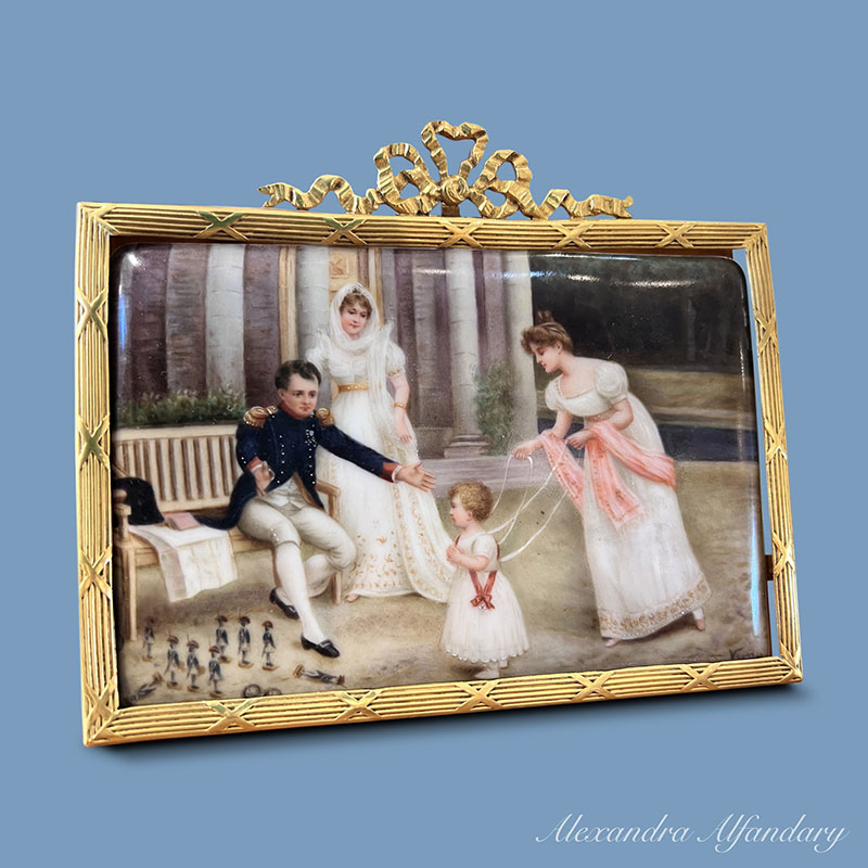 This charming porcelain plaque decorated with Napoleon I greeting his son (Roi de Rome) with outstretched arms and his second wife Marie Louise of Austria beside him, the boy’s toy soldiers on the floor, a charming intimate picture of Napoleon I and his family. The plaque indistinctly signed ‘Wagner’ to right hand corner, plaque set in a gilt metal frame.