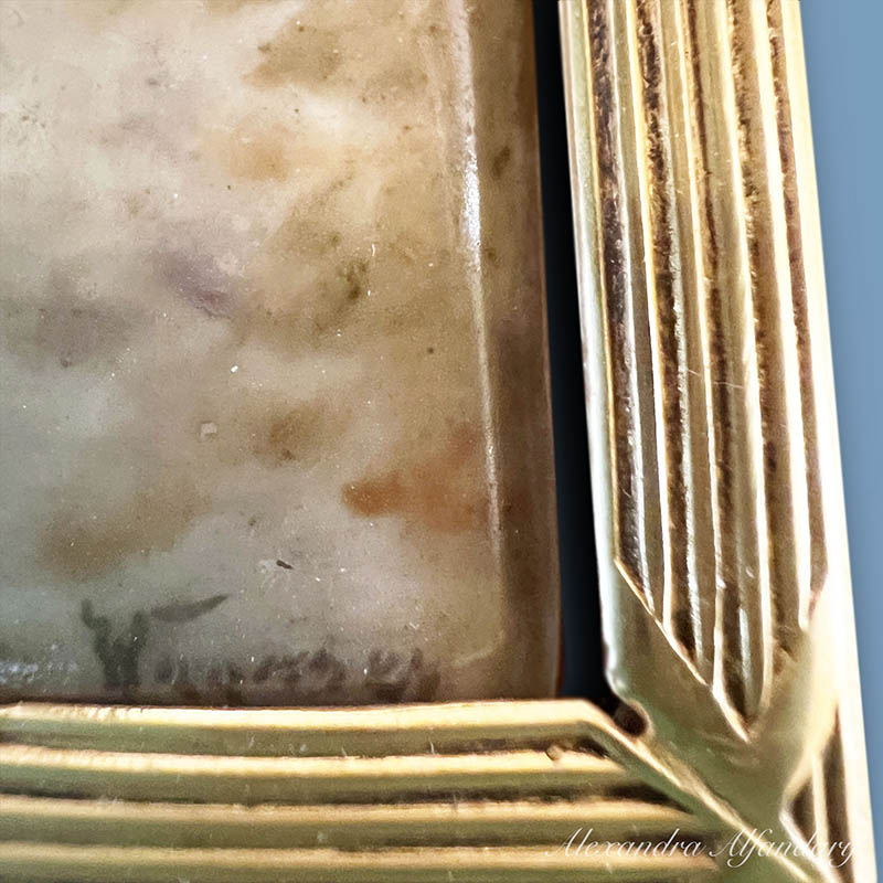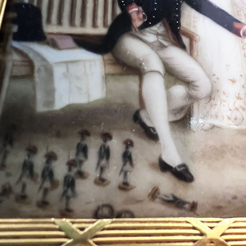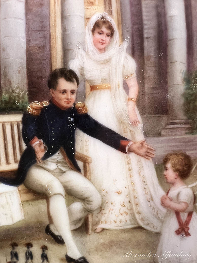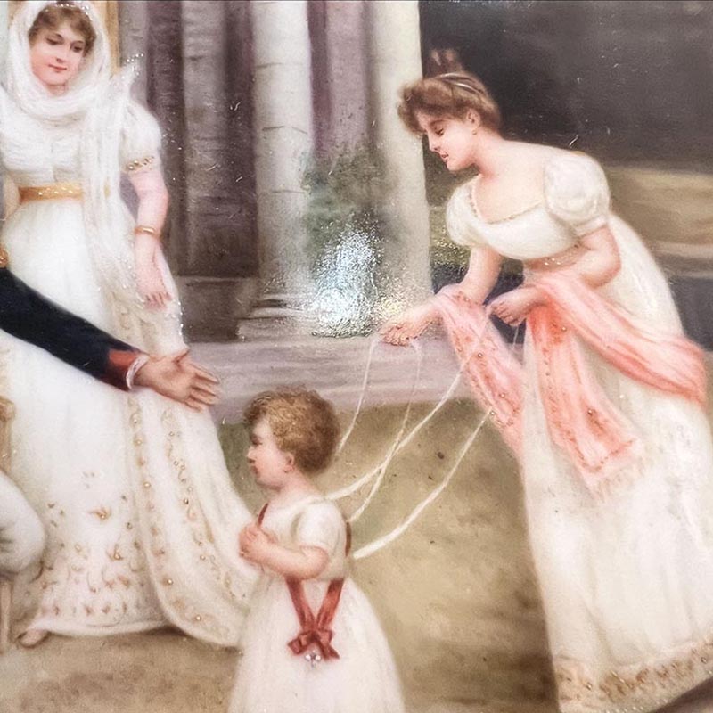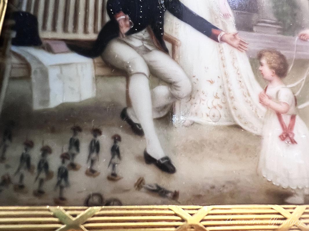 This charming porcelain plaque decorated with Napoleon I greeting his son (Roi de Rome) with outstretched arms and his second wife Marie Louise of Austria beside him, the boy’s toy soldiers on the floor, a charming intimate picture of Napoleon I and his family. The plaque indistinctly signed ‘Wagner’ to right hand corner, plaque set in a gilt metal frame.