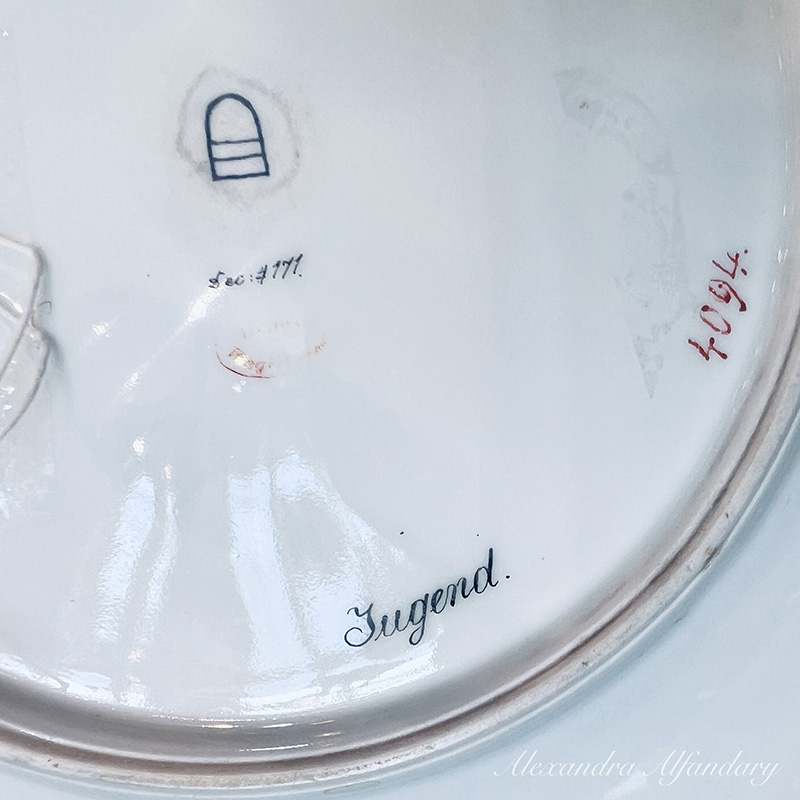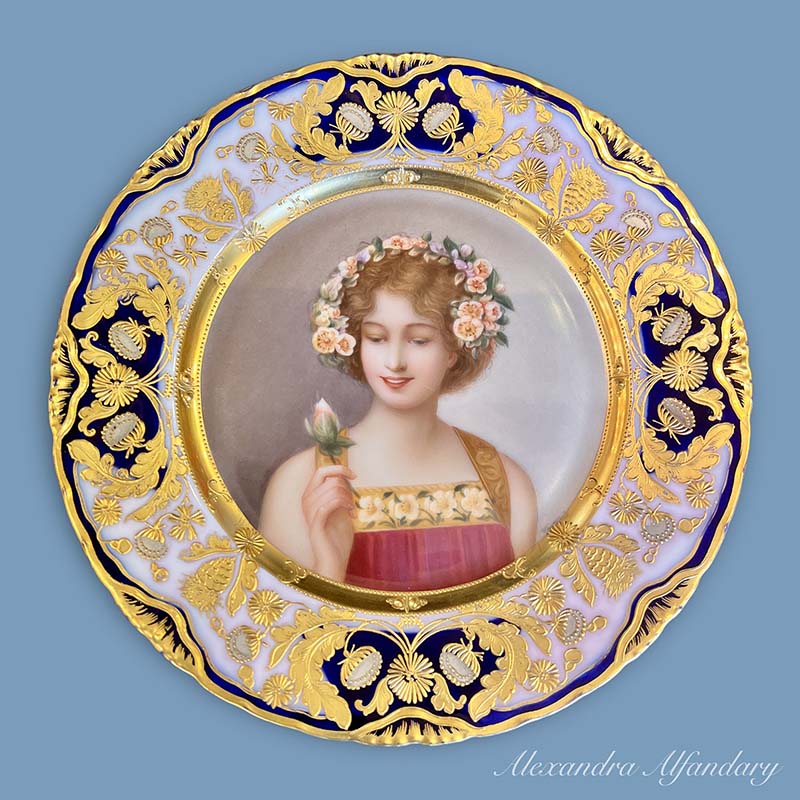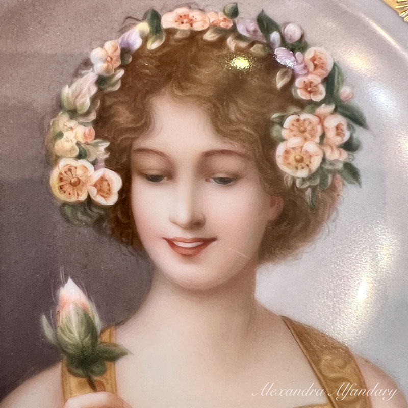 A charming porcelain portrait plate painted with a portrait of a smiling young woman holding a rosebud, her hair adorned with pink roses, entitled to back ‘Jugend’ (Youth), signed Wagner to side of portrait, the rim of plate decorated with raised gilded flowers,faux Vienna marks to back.