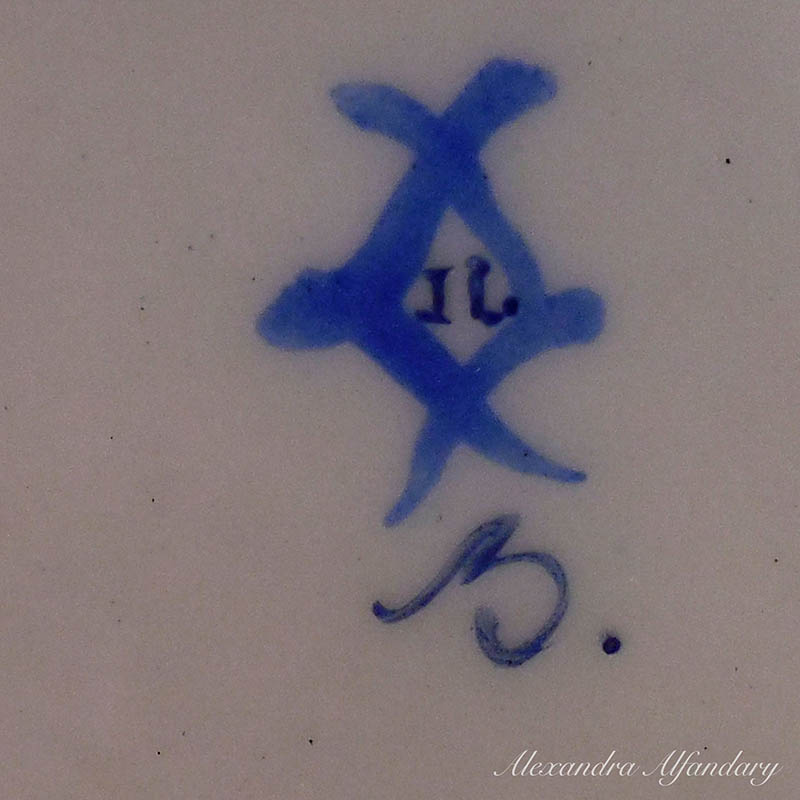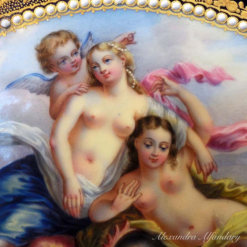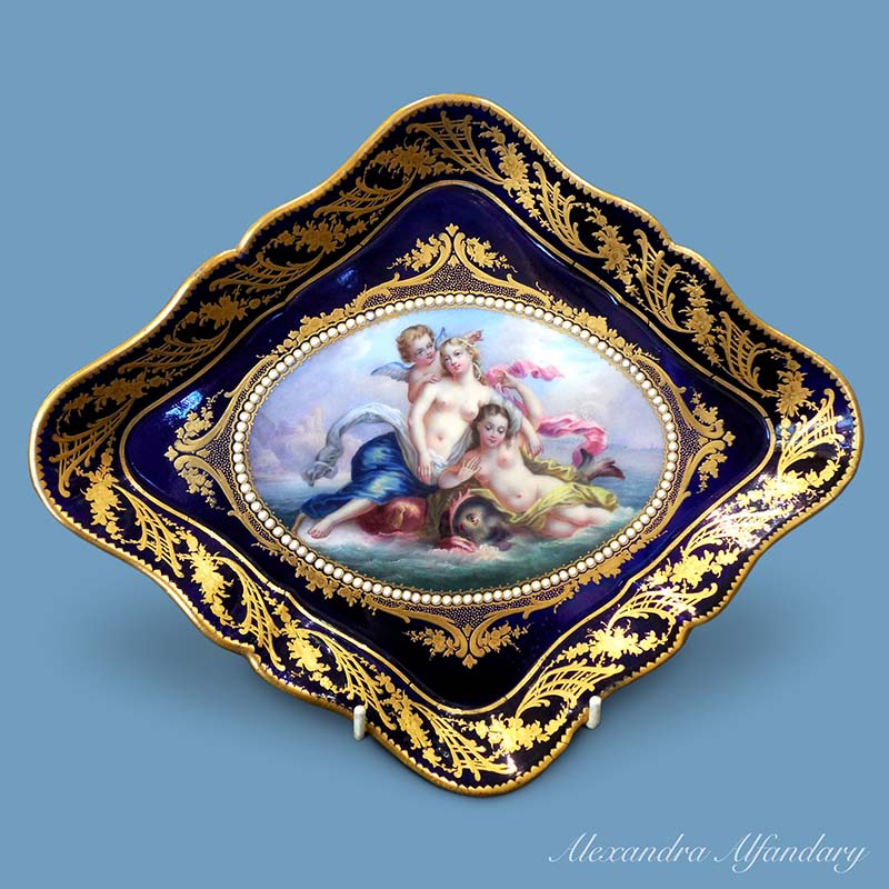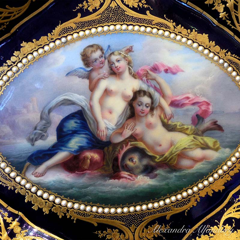 This platter is painted in the Sevres style with Venus arising from the sea with attendant and Armor, the central cartouche with faux jewelling , intricate gilded scroll work all on cobalt blue ground, the back to platter with Initials J.C. and painted initials B, French porcelain, c. 1880.
