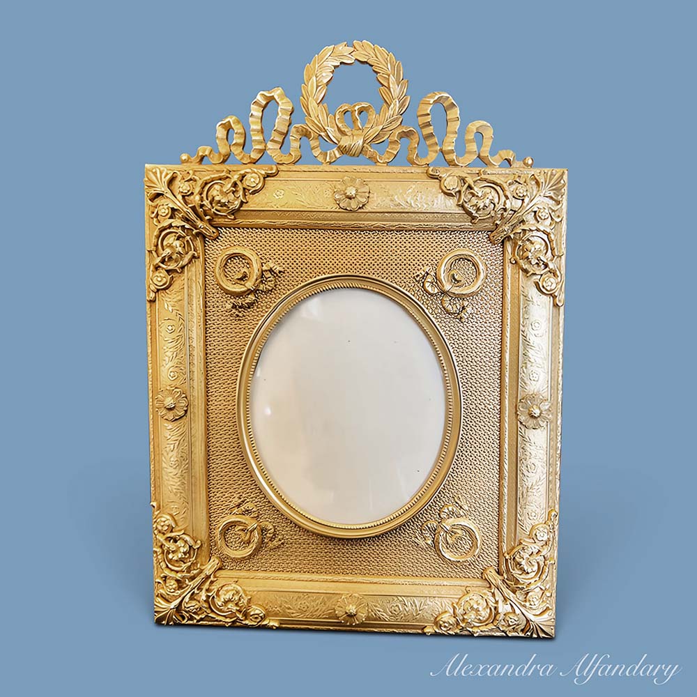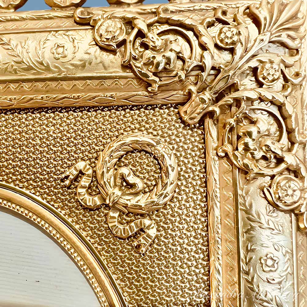 The ormolu frame with ornate ormolu decoration of garlands to frame, flower decor applied over each corner, garlands and victory wreath to top of frame.