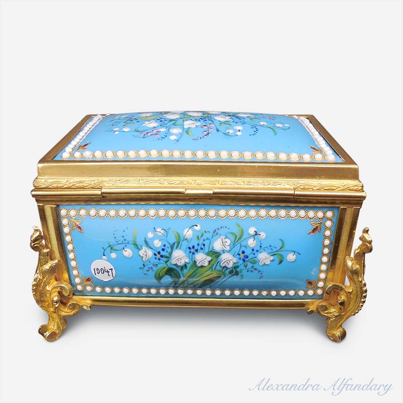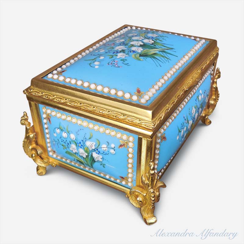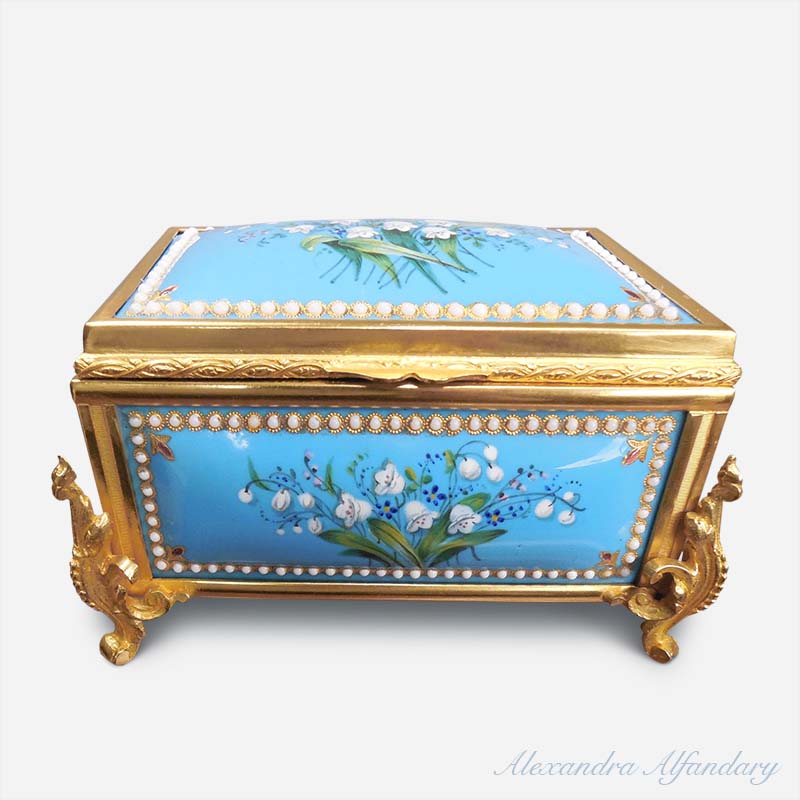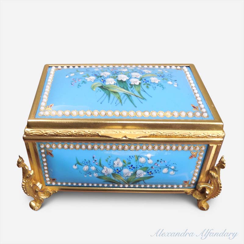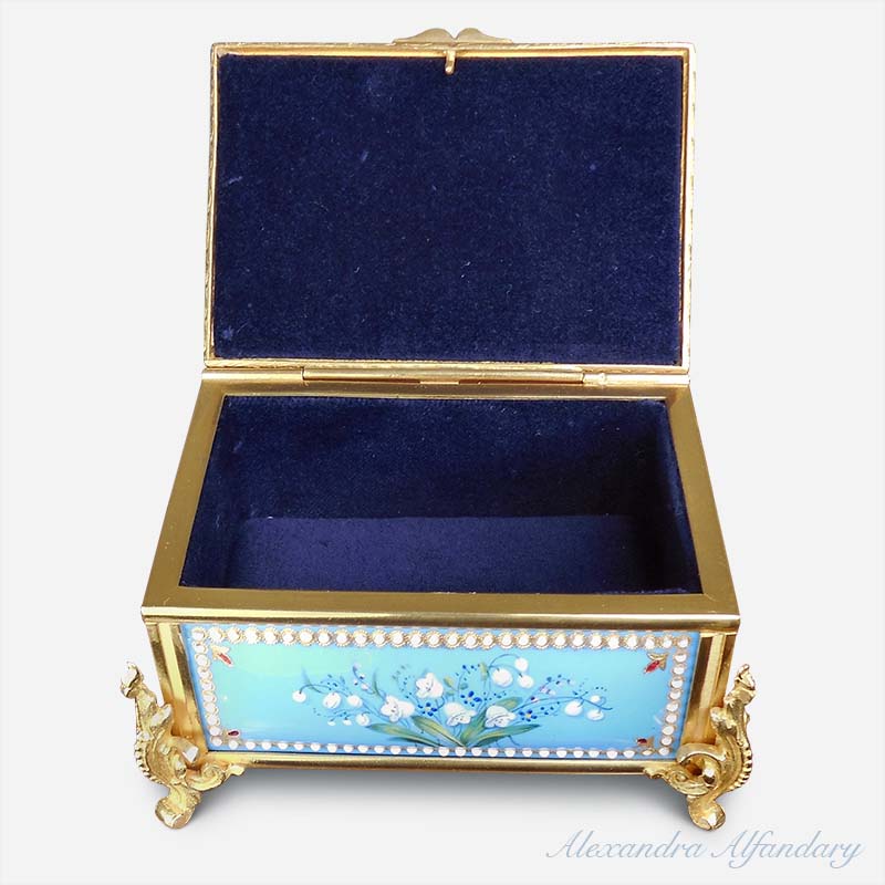 A French enamel Box from the Belle Epoque with panels painted with lilly-of-the-valley on blue ground, the panels all decorated with faux jewelling, he interior lined with blue felt.