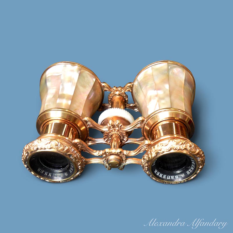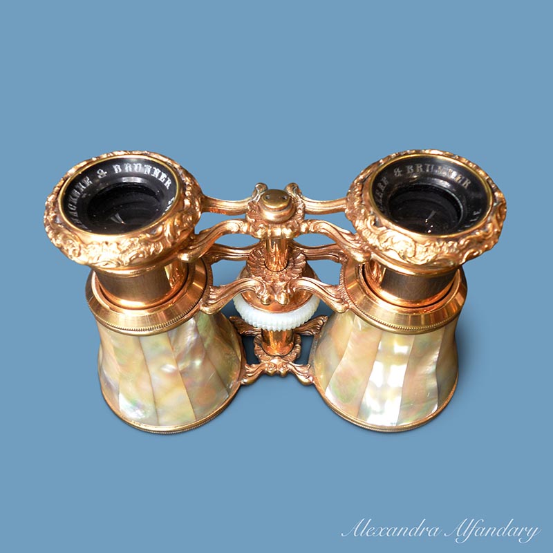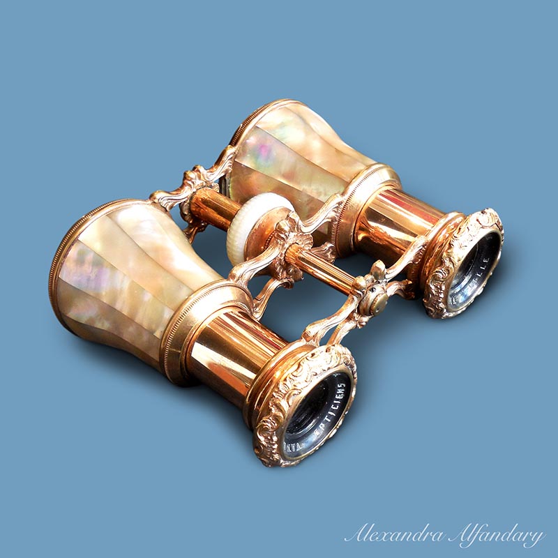 The pair of French opera glasses with mother of pearl drums, beautifully elaborately worked gilt metal mounts, name of retailing optician to eyepieces.