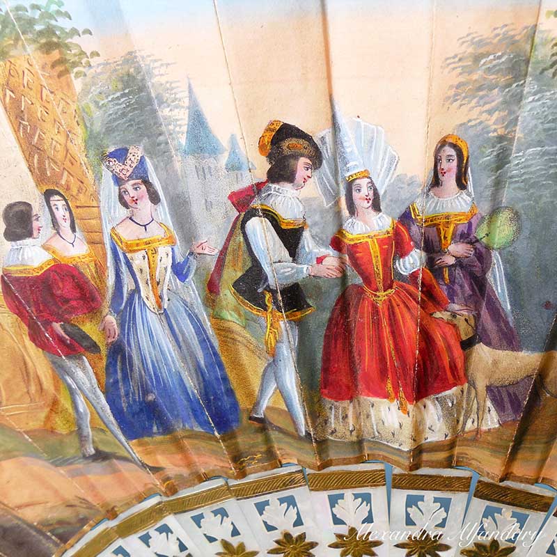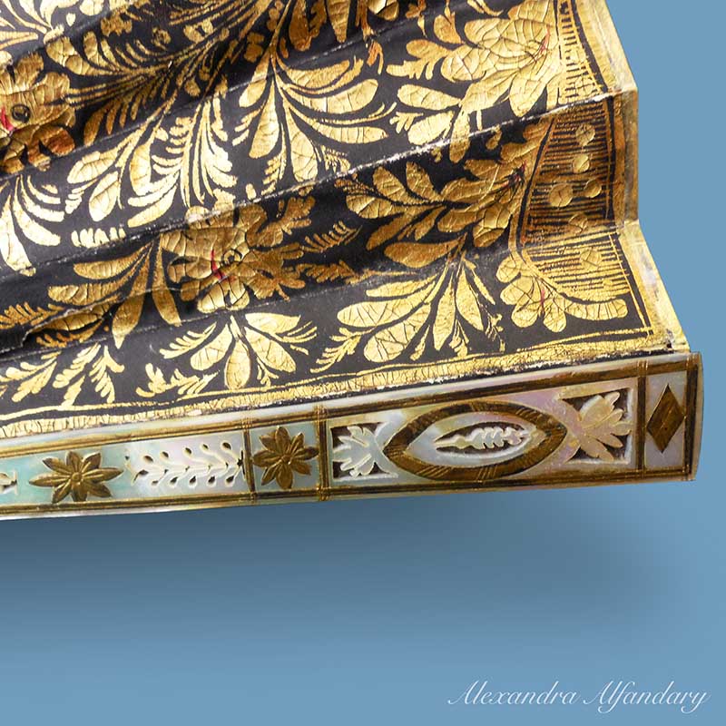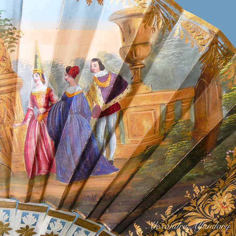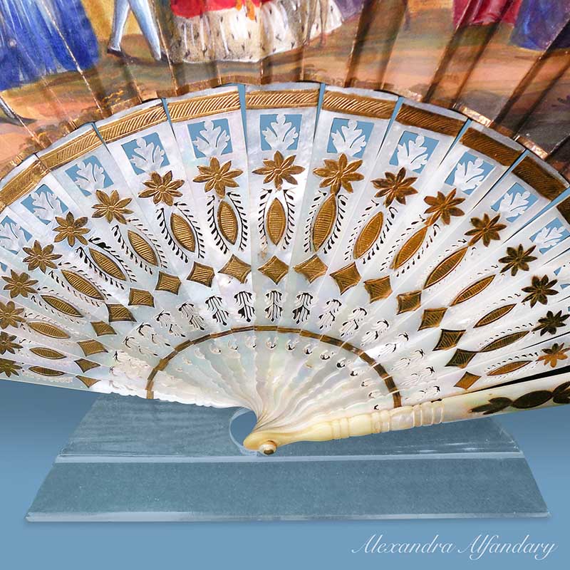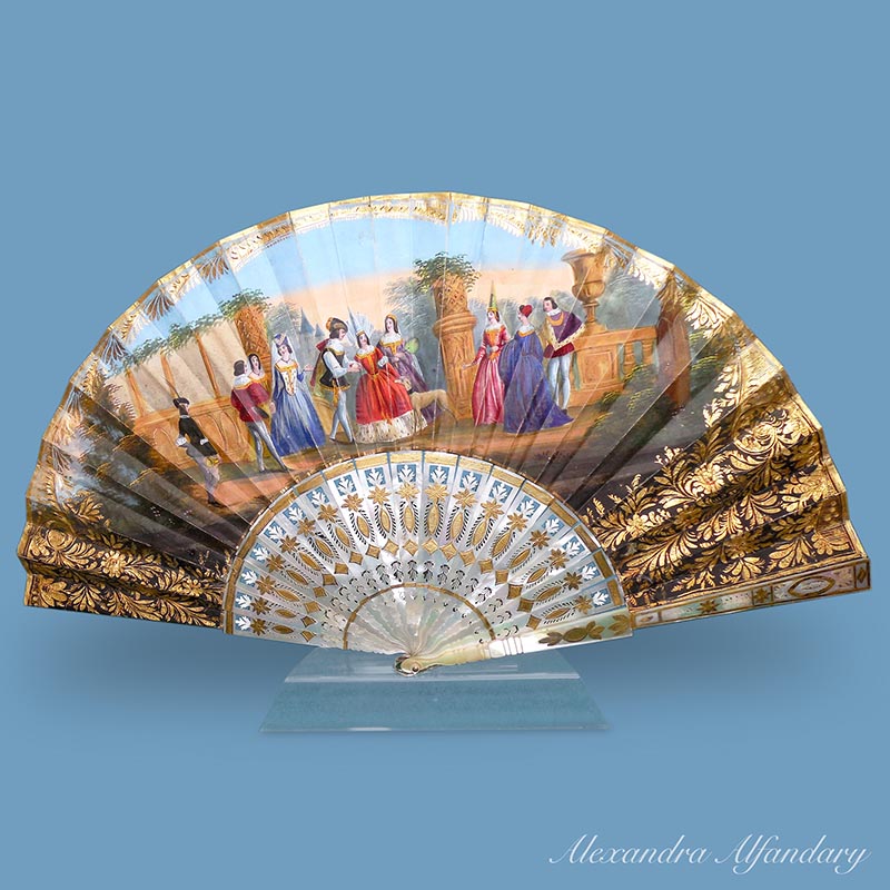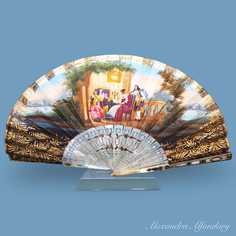 This Fan is finely painted with romantic Royal Court scenes, gold leaf decoration to sides, mother of pearl sticks with silver gilt inlay.