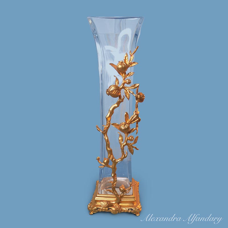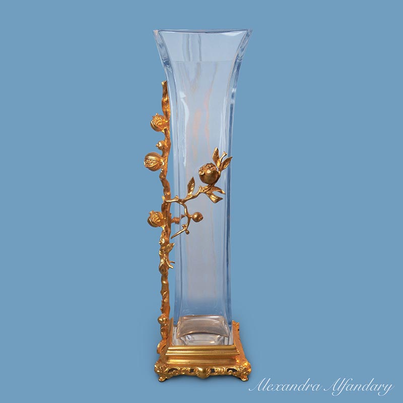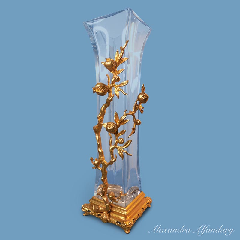The Baccarat Vase standing on a gilt bronze stand of branching fruit buds, the Baccarat vase fitting into a square ormolu base, the Baccarat vase elegantly fluted to upper part.
