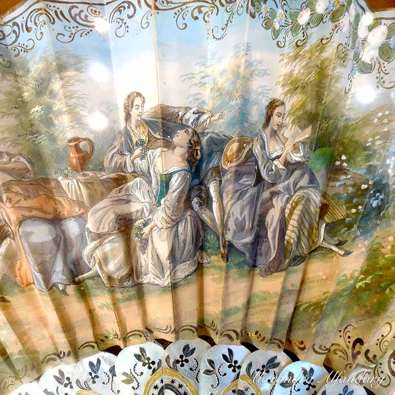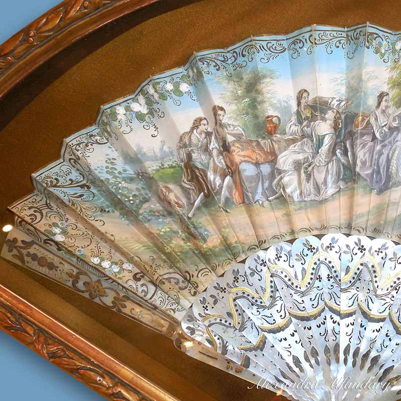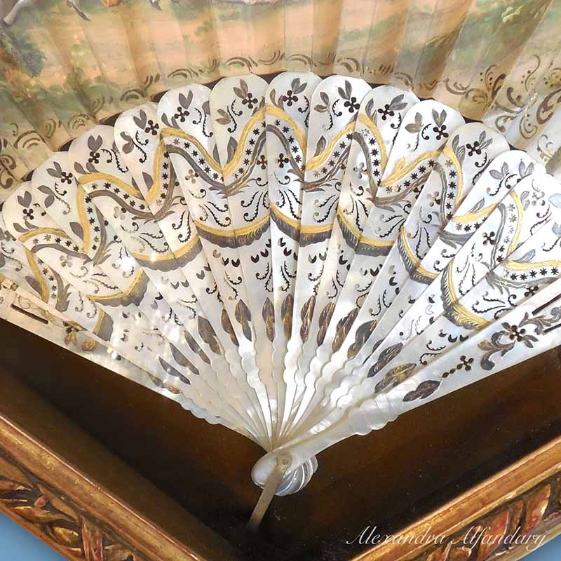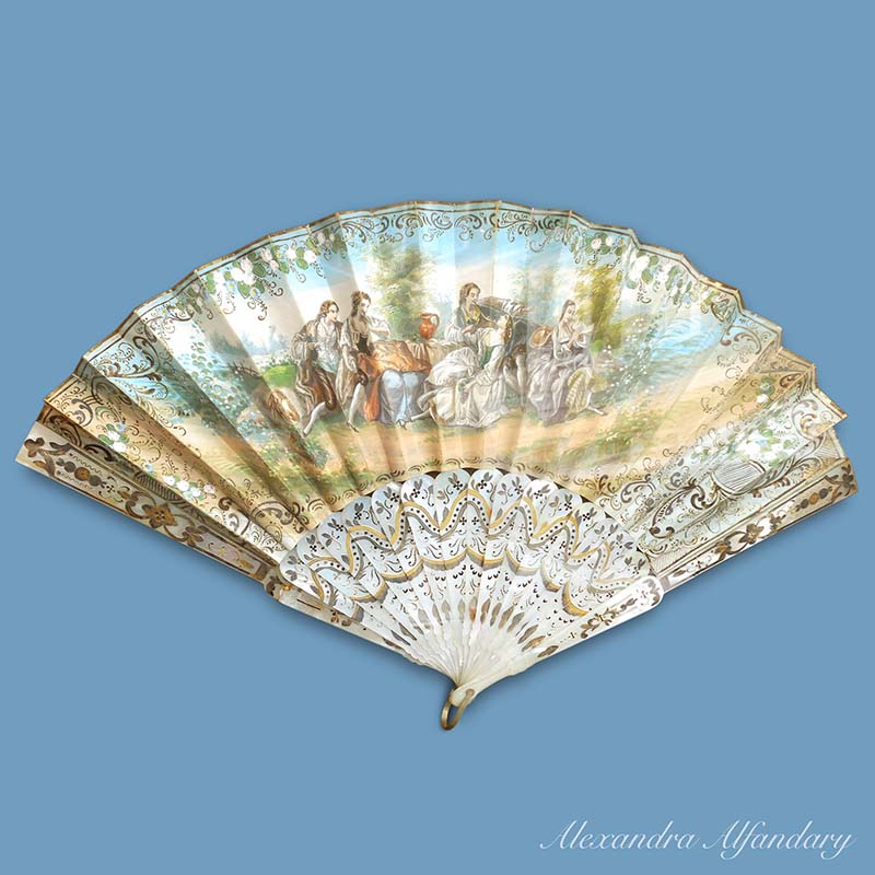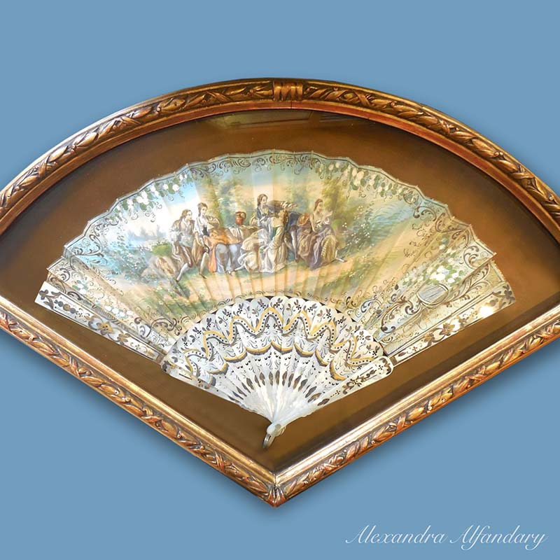 The fan painted with a scene of romantic couples in garden landscape, the mother of pearl sticks finely carved with intricate pattern, silver and gold inlay, the fan fitted into a gilt wooden case, French c 1860.