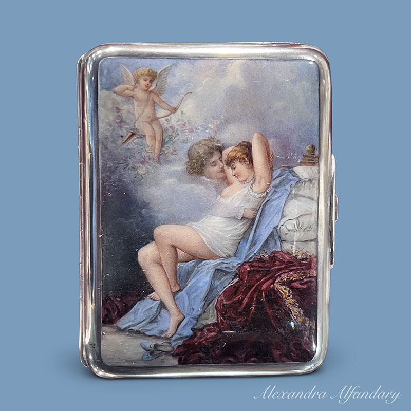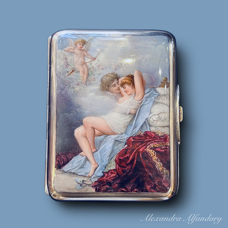The case with en enamel scene of lovers with cupid in attendance, the young woman dreaming of her lover, applied gold decoration with semi precious stones.