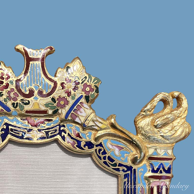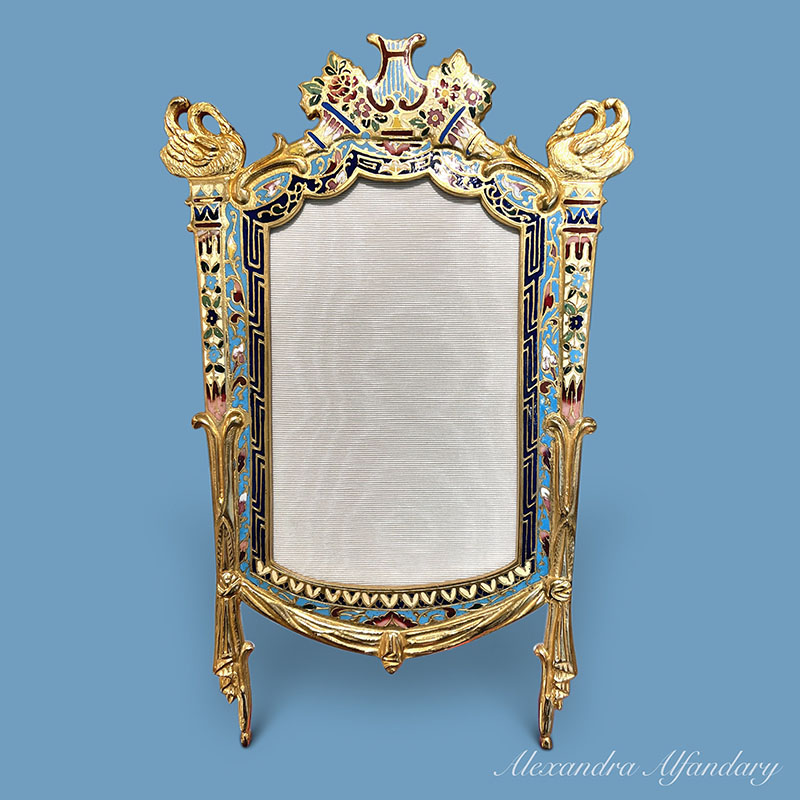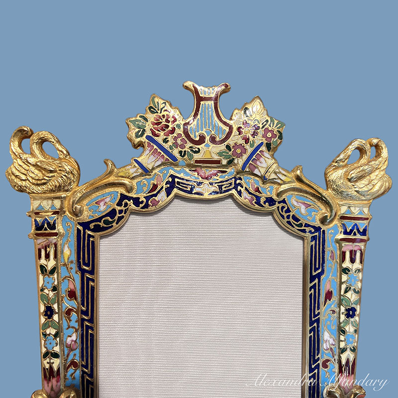 The French enamel (champlevé) frame with fine multicolour enamelled work on gilt metal with swans to each top of frame, standing on gilt metal feet.