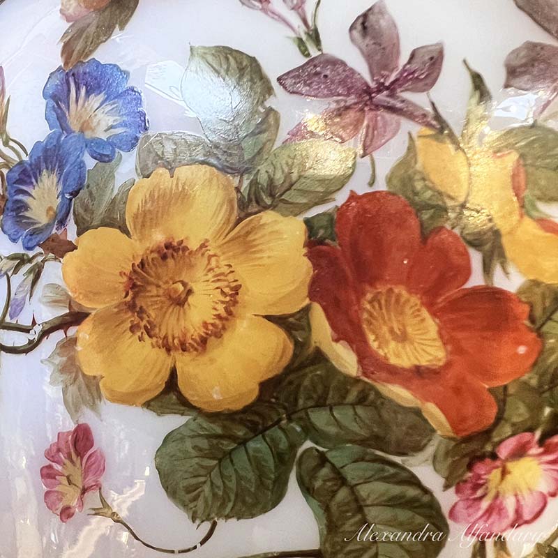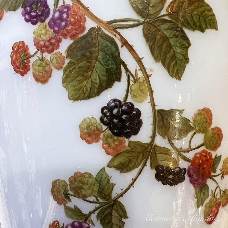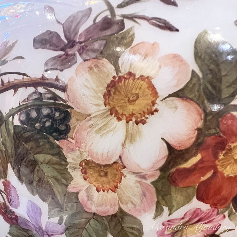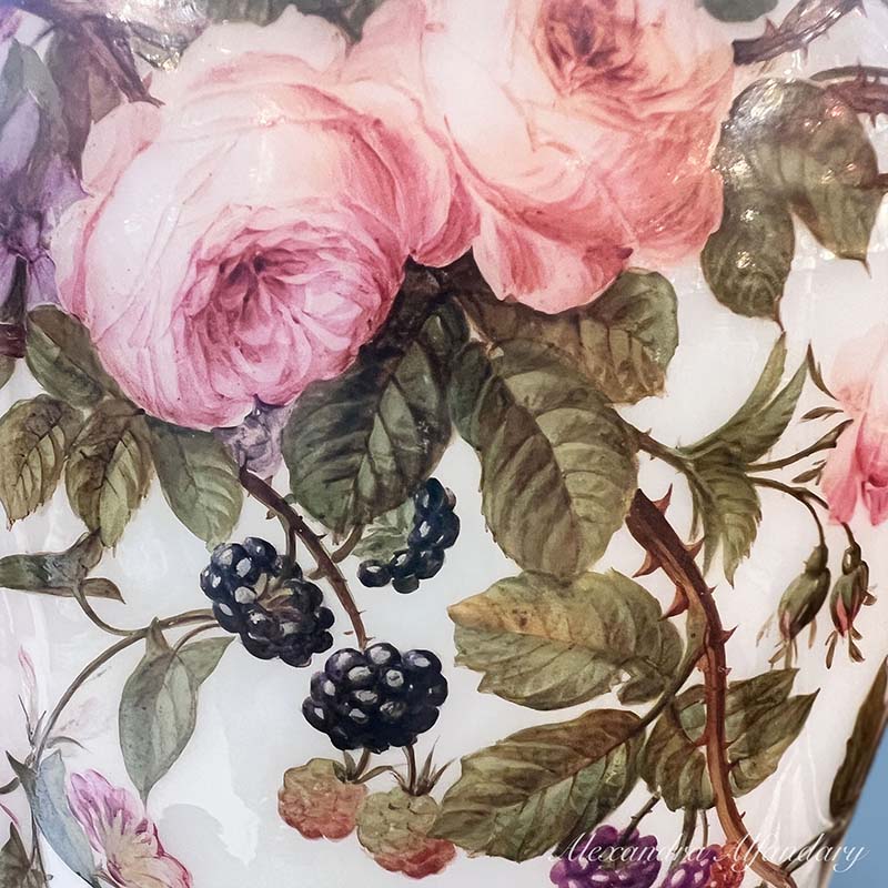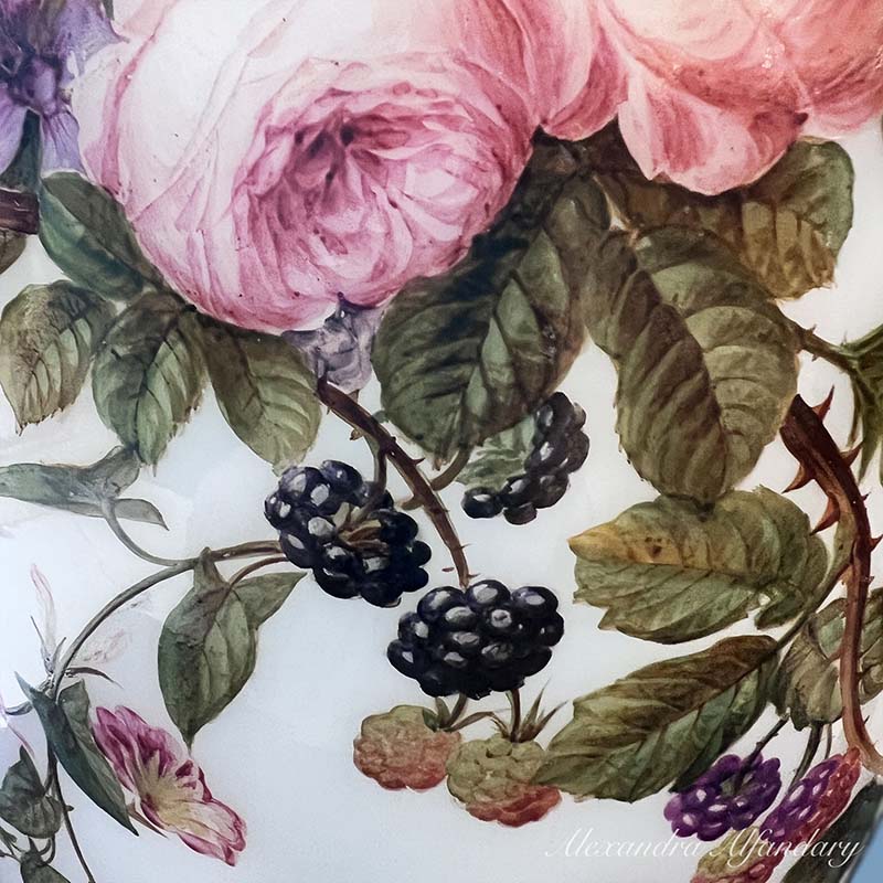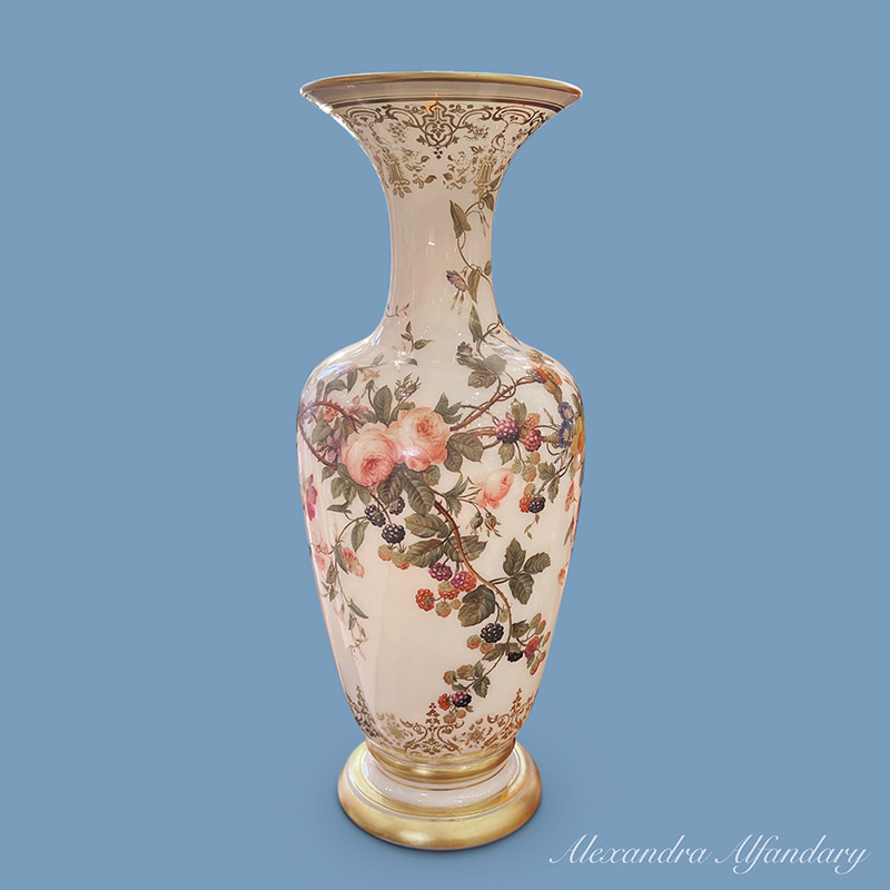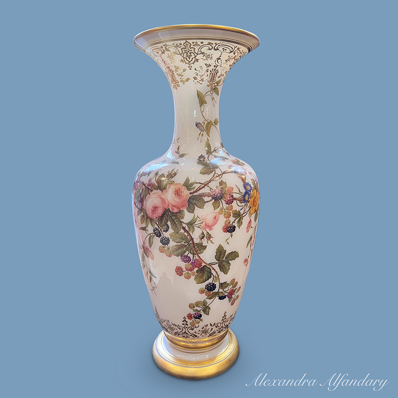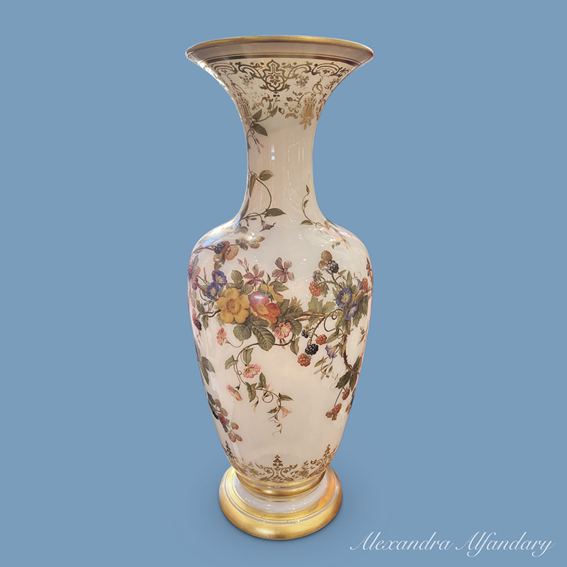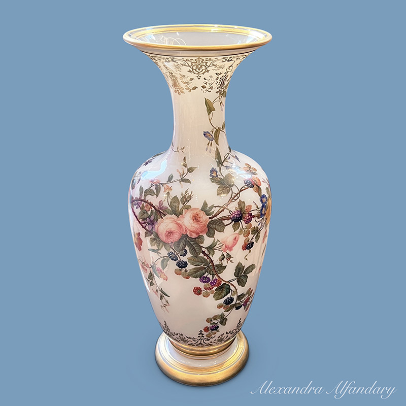 This beautiful baccarat vase is painted in detail with garlands of summer flowers and berries, gilded decoration to neck of vase and gilded lip and base.