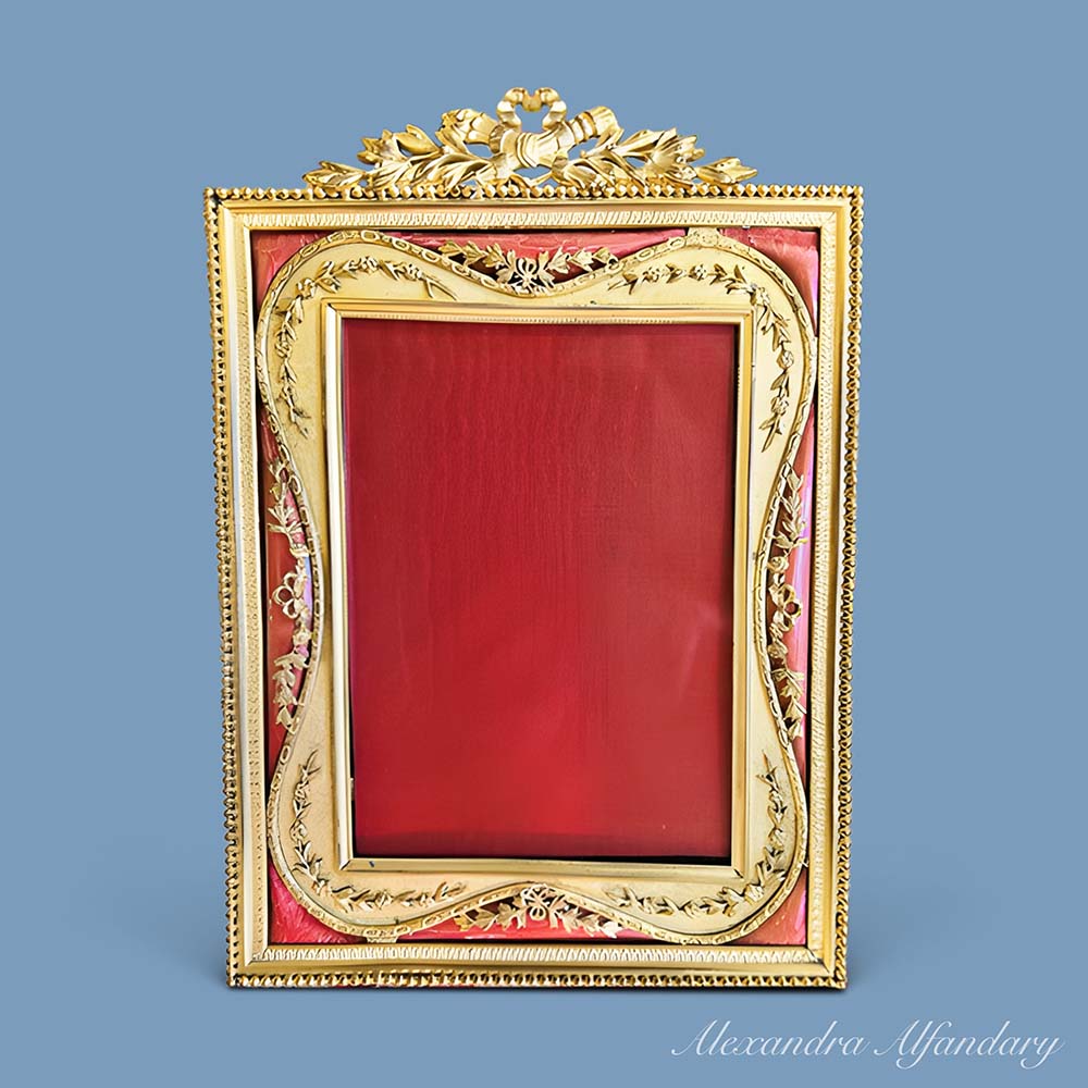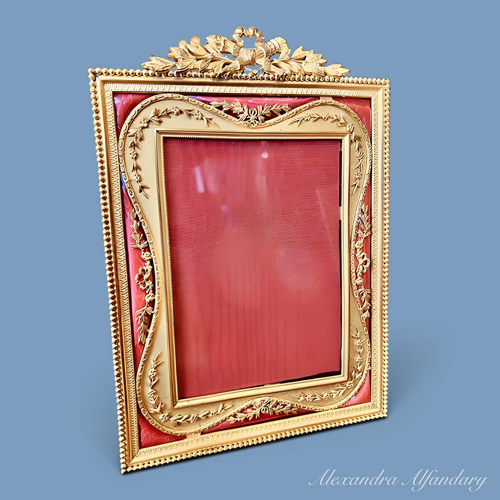 The frame with pink rose coloured enamel and ormolu decor of garlands, leaves and torches.