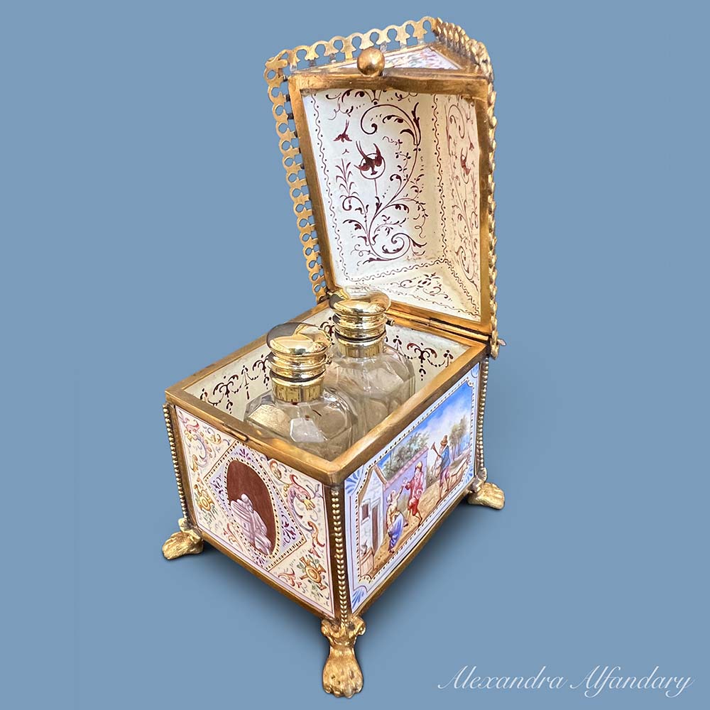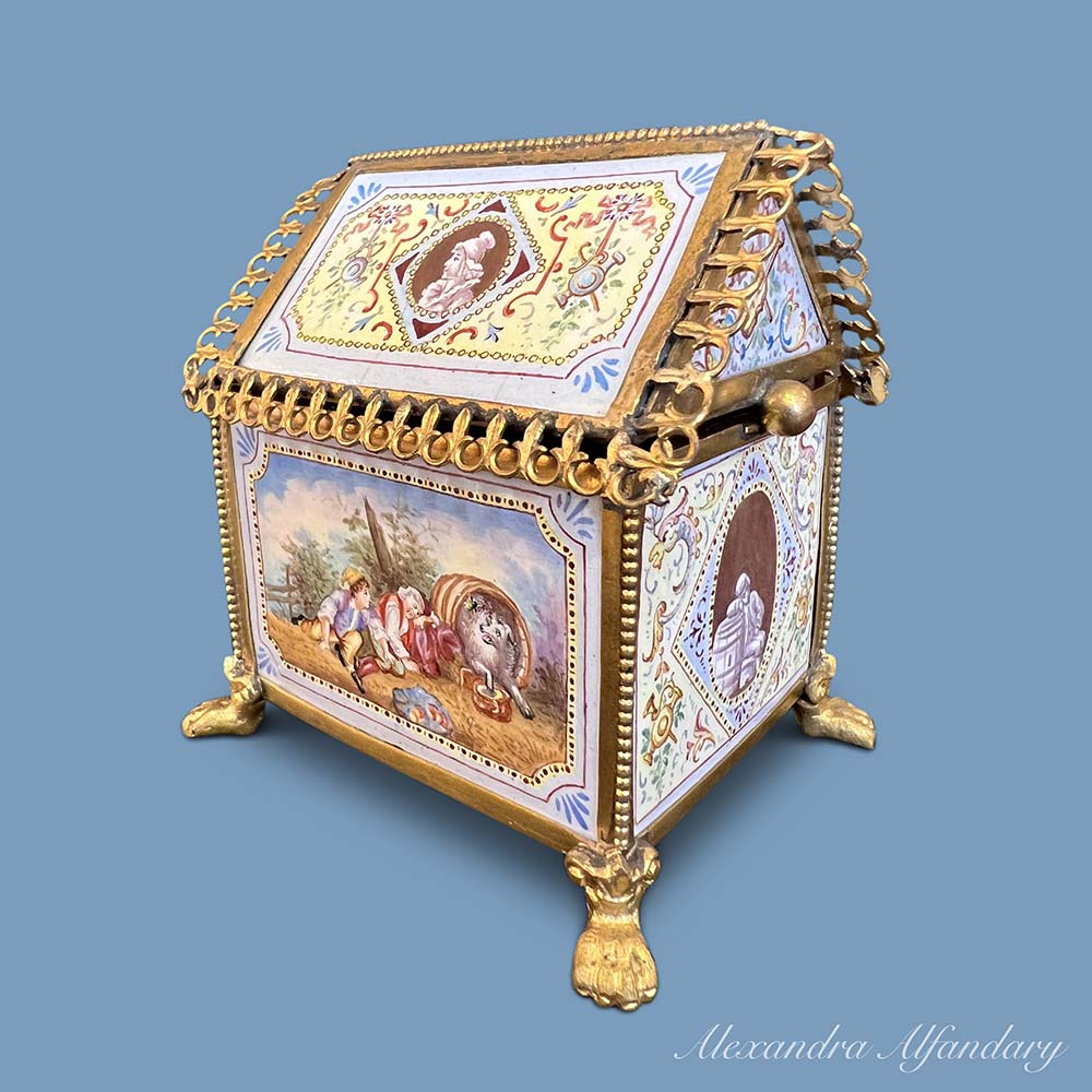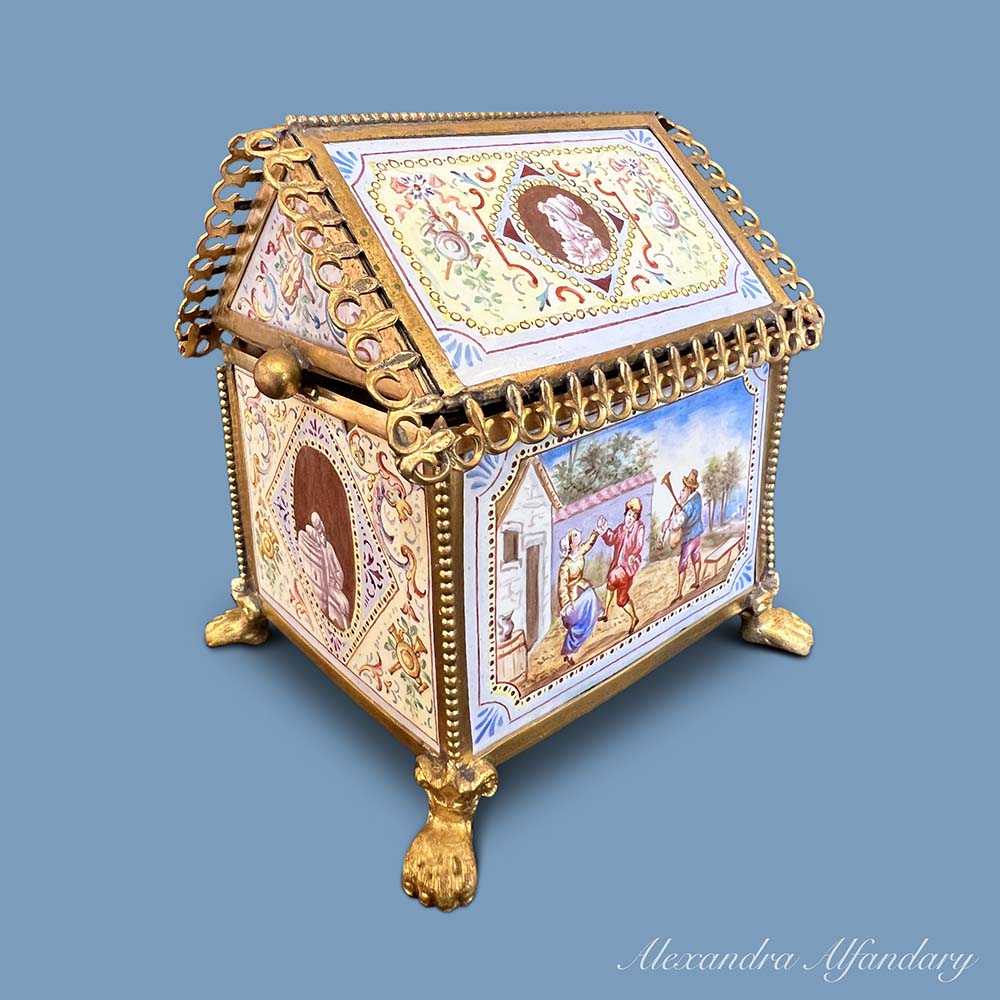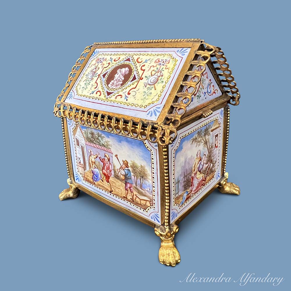 The French enamel box in the shape of a small hut is decorated to all sides with dancing couples and country scenes, portraits and garlands.