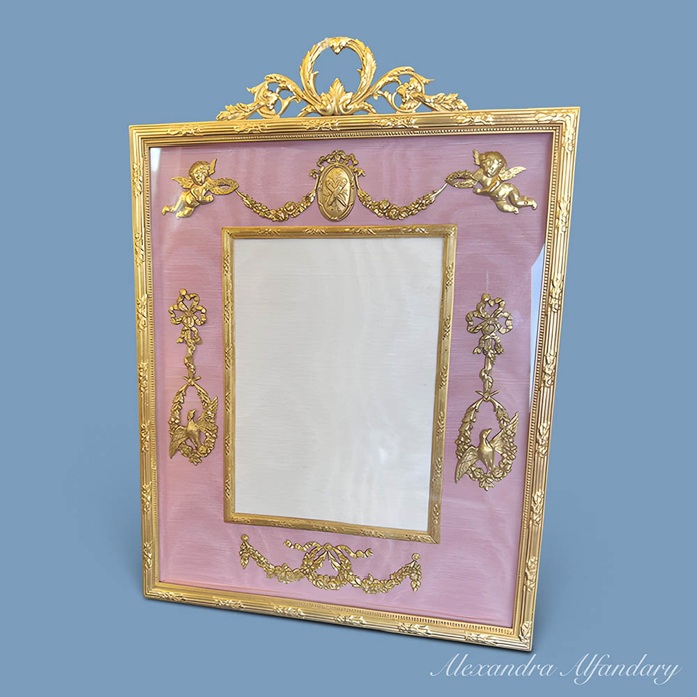 The gilt metal frame with swags of garlands with turtle doves and cupids holding flower garlands with medallion to centre, from the Belle Epoque.