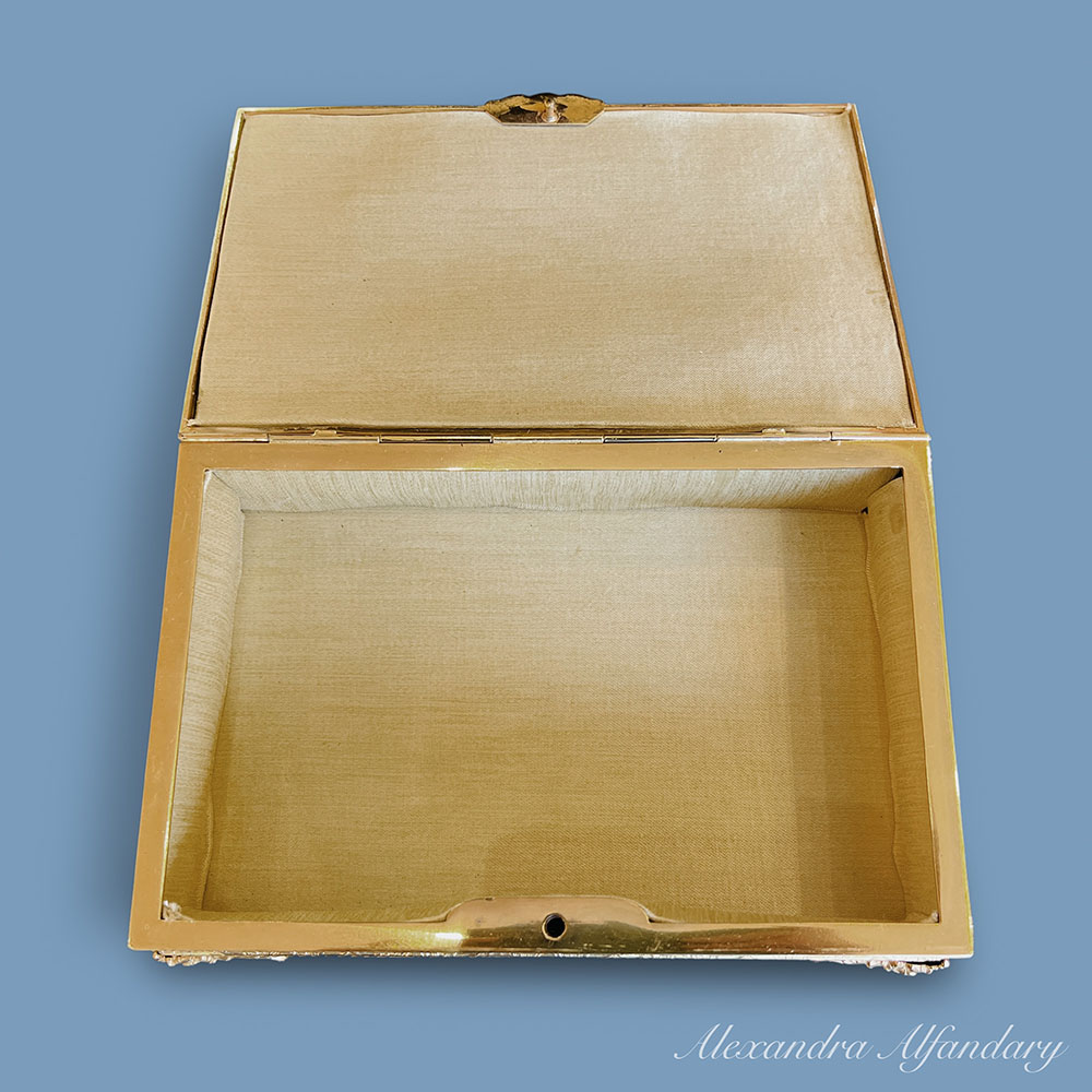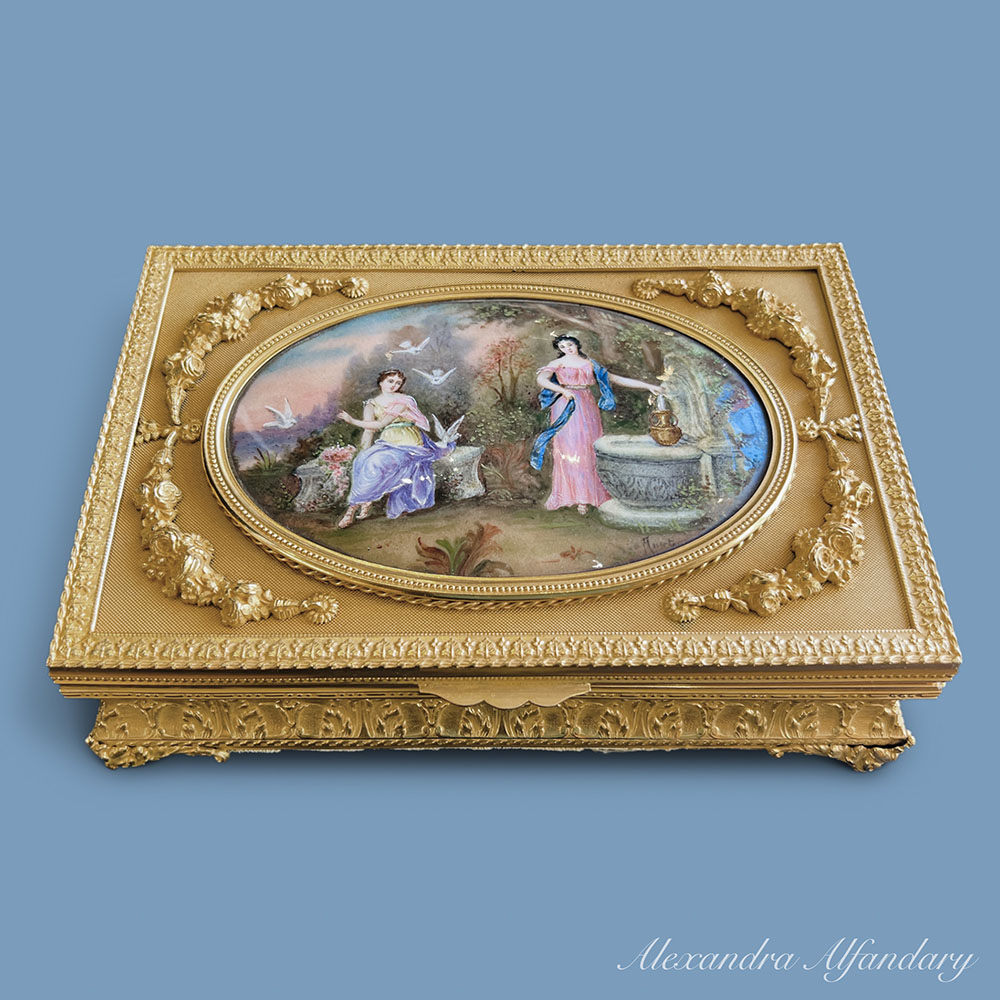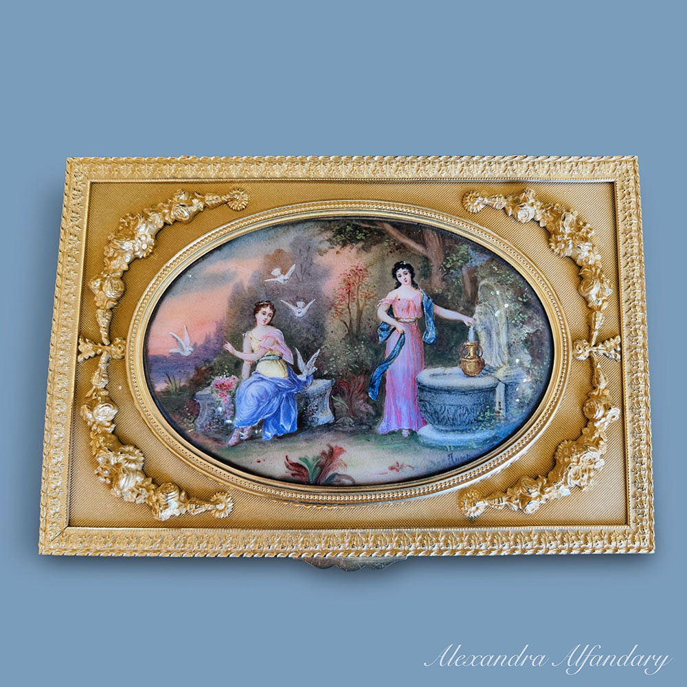The French ormolu box is profusely decorated in relief with leaves and flowers, the lid with ormolu garlands and a central enamel plaque painted with polychrome females next to fountain with turtle doves indistinct signature to bottom right side.