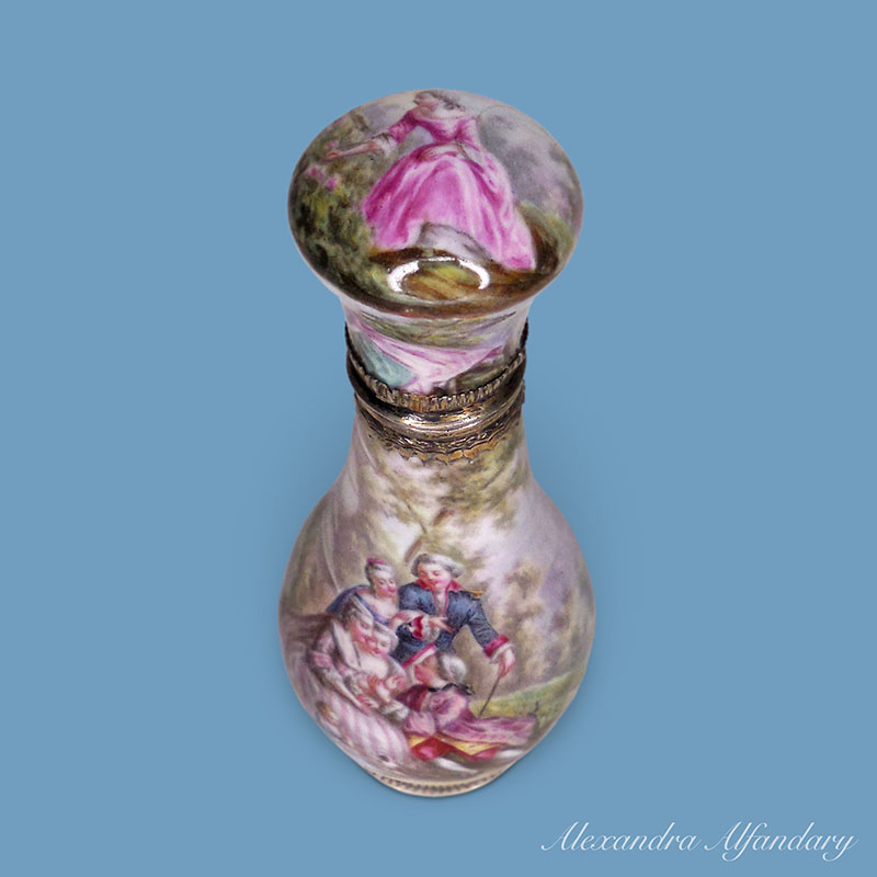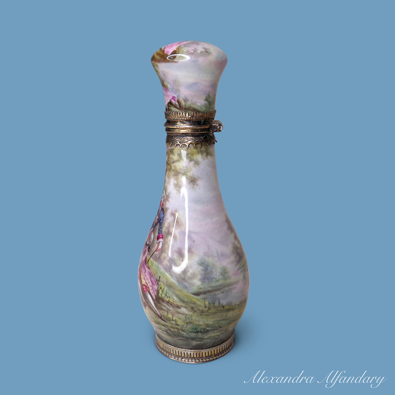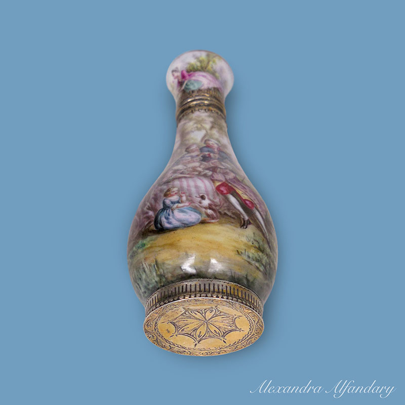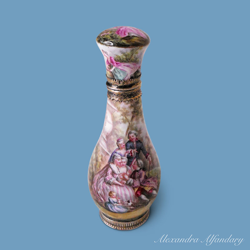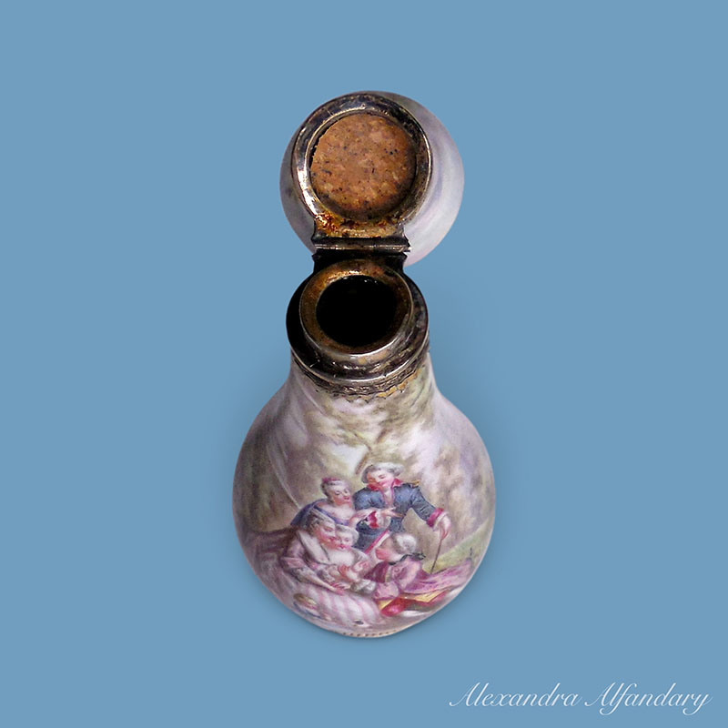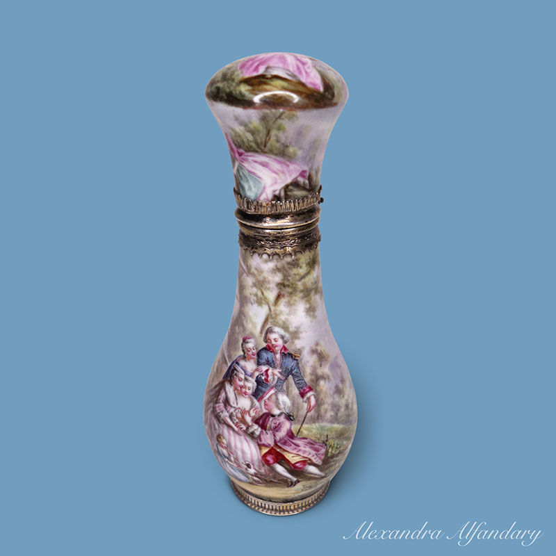 The enamel and silver scent bottle beautifully decorated with lovers dressed in 18th century costumes, set in a garden with young ladies and companion, enamelled all over with silver base and collar, French c1900.