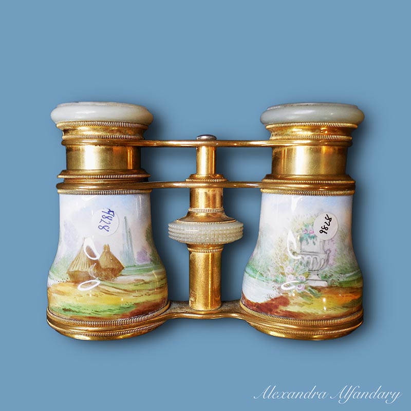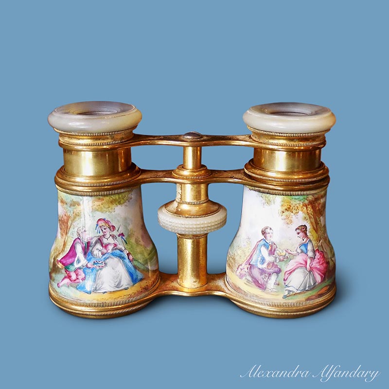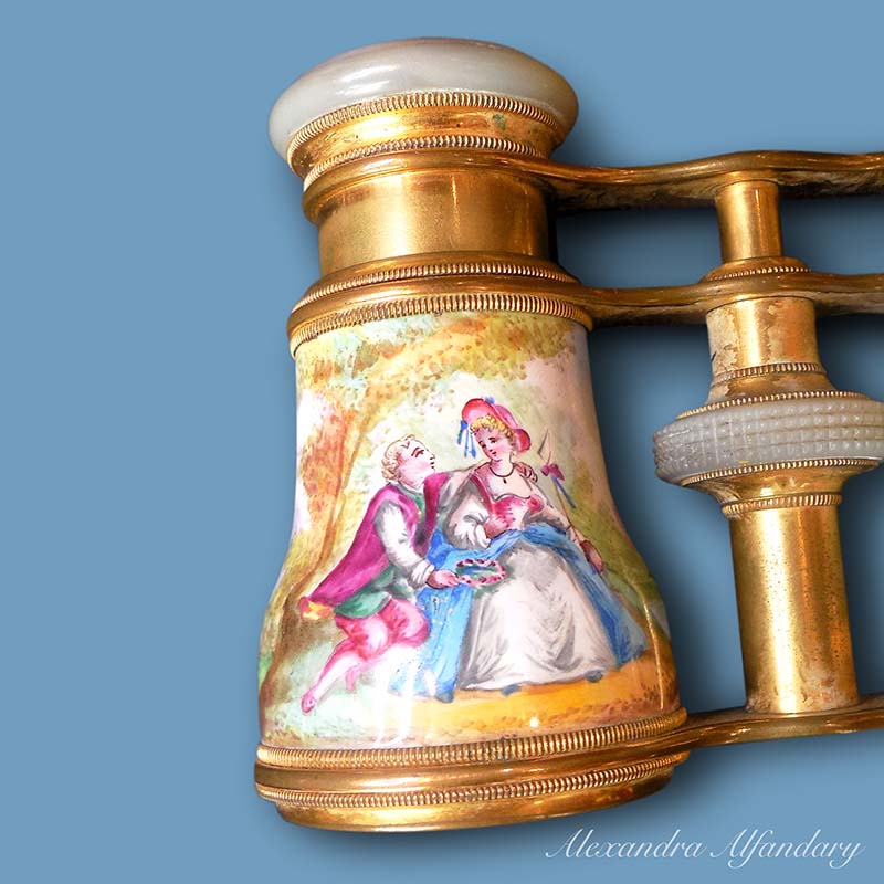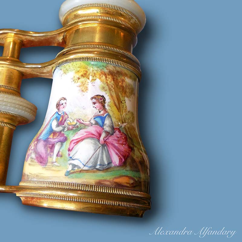The French opera glasses are decorated with romantic couples to both drums to front and decoration to back, all on gilt brass mounts.